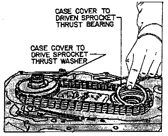 11. Remove case cover to drive sprocket thrust washer and driven sprocket thrust bearing assembly, Fig. 17. Case cover to drive sprocket thrust washer may be on case cover.