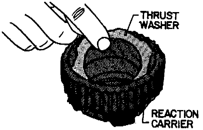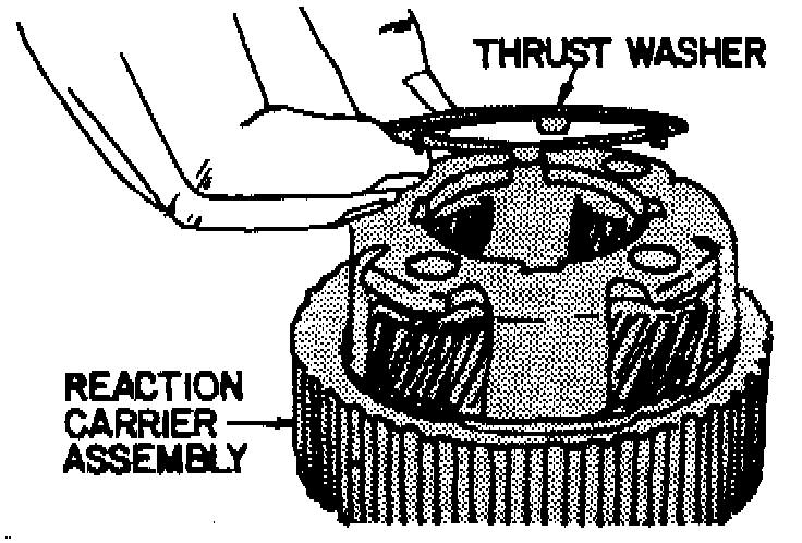 6. Check the four tanged reaction carrier to internal gear thrust washer, Low roller clutch cam and reaction carrier bushing for wear or damage.