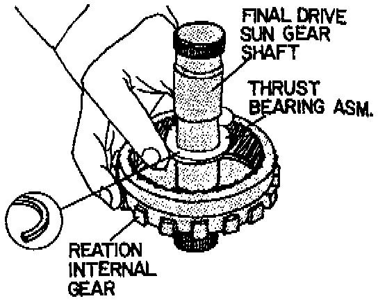 3. Check reaction internal gear splines, gear teeth and bearing surface for wear or damage. Install reaction internal gear on the final drive sun gear shaft with the gear teeth up, Fig. 45. Install reaction internal gear to reaction sun gear roller thrust bearing with inner race against reaction internal gear, Fig. 45.