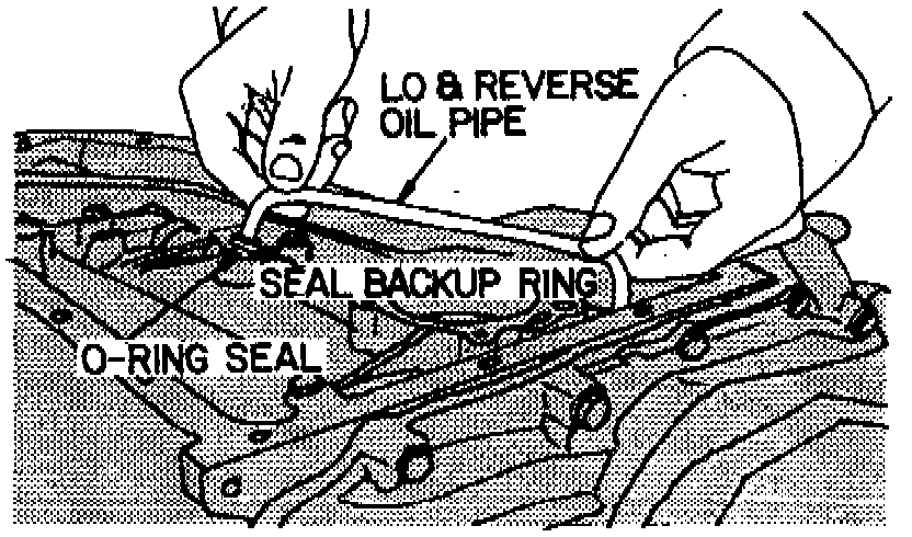 5. Install O-ring back-up washer, then install O-ring seal on reverse oil pipe and install reverse oil pipe. Install plain end first, then install O-ring end into low-reverse seal bore, Fig. 6.