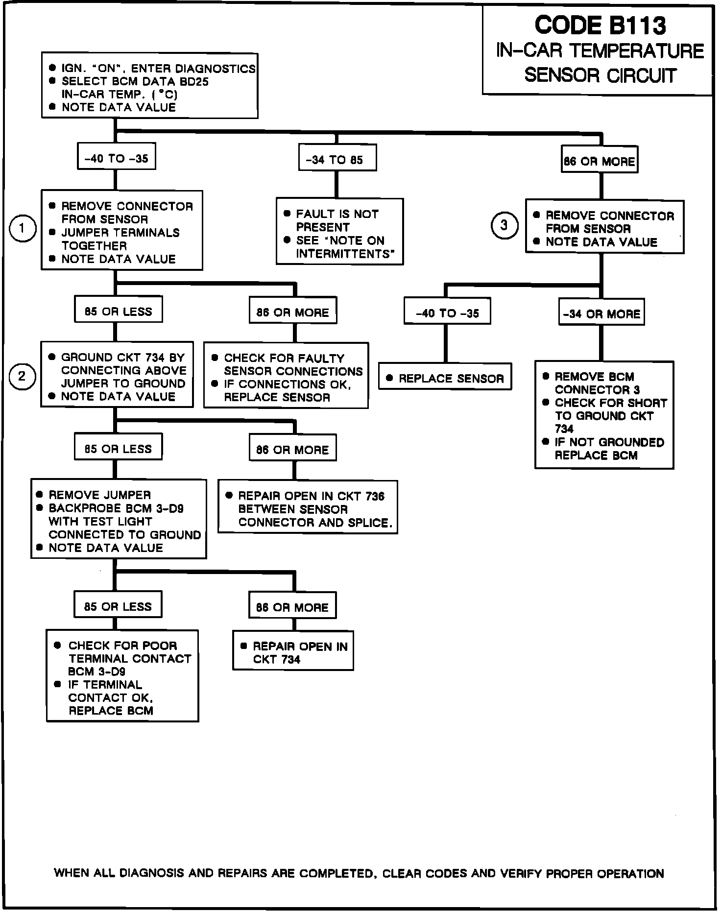 If code B113 is set with code B115, check for an intermittent open in circuit 736 between splice S2 and the IP to dash transition block. If an intermittent Code B113 is being set, check the B113 snap data value for in-car temperature, BD25. If the BD25 value is under -34°C, the code was caused by an open in circuit 734, circuit 736, or the in-car temp sensor. If the BD25 value is over 85°C, the code was caused by a short to ground on circuit 734 or a shorted in-car temp sensor. Manipulate the related wiring while observing BCM data BD25. If the failure is induced, the reading will jump from its normal value to a reading outside the range of -34°C to 85°C.