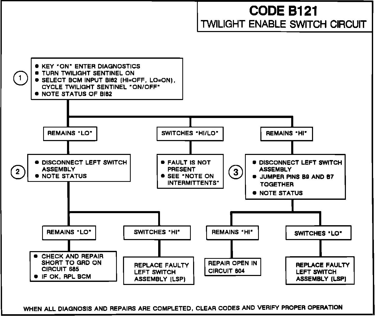 Code B121 will set, if the vehicle is equipped with twilight sentinel, the twilight delay pot has not failed (code B120), and the signal voltage is high, when the delay slider is above 2.0 seconds delay (twilight sentinel on), or signal voltage is low when the delay slider is below 3.0 seconds (twilight sentinel off). During the time the failure is present, the twilight sentinel will operate based on the delay input. Whenever the delay input is above 2.0 seconds, the BCM will assume the twilight sentinel is "ON."