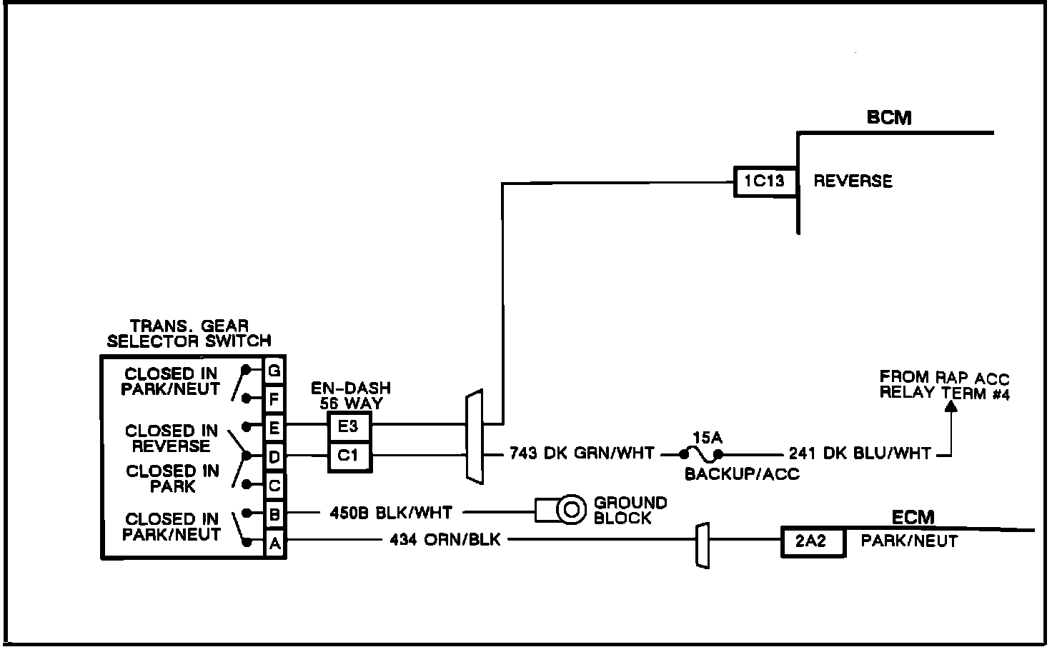 2. ECM input EI74 displays P/N gear status, as "HI" or "LO" depending on the voltage state at the ECM. The display should read "LO" only when the transaxle is in Park or Neutral. If it reads "LO" in any other gear selection the switch must be misadjusted, or CKT 343 (including the switch) is shorted to ground.