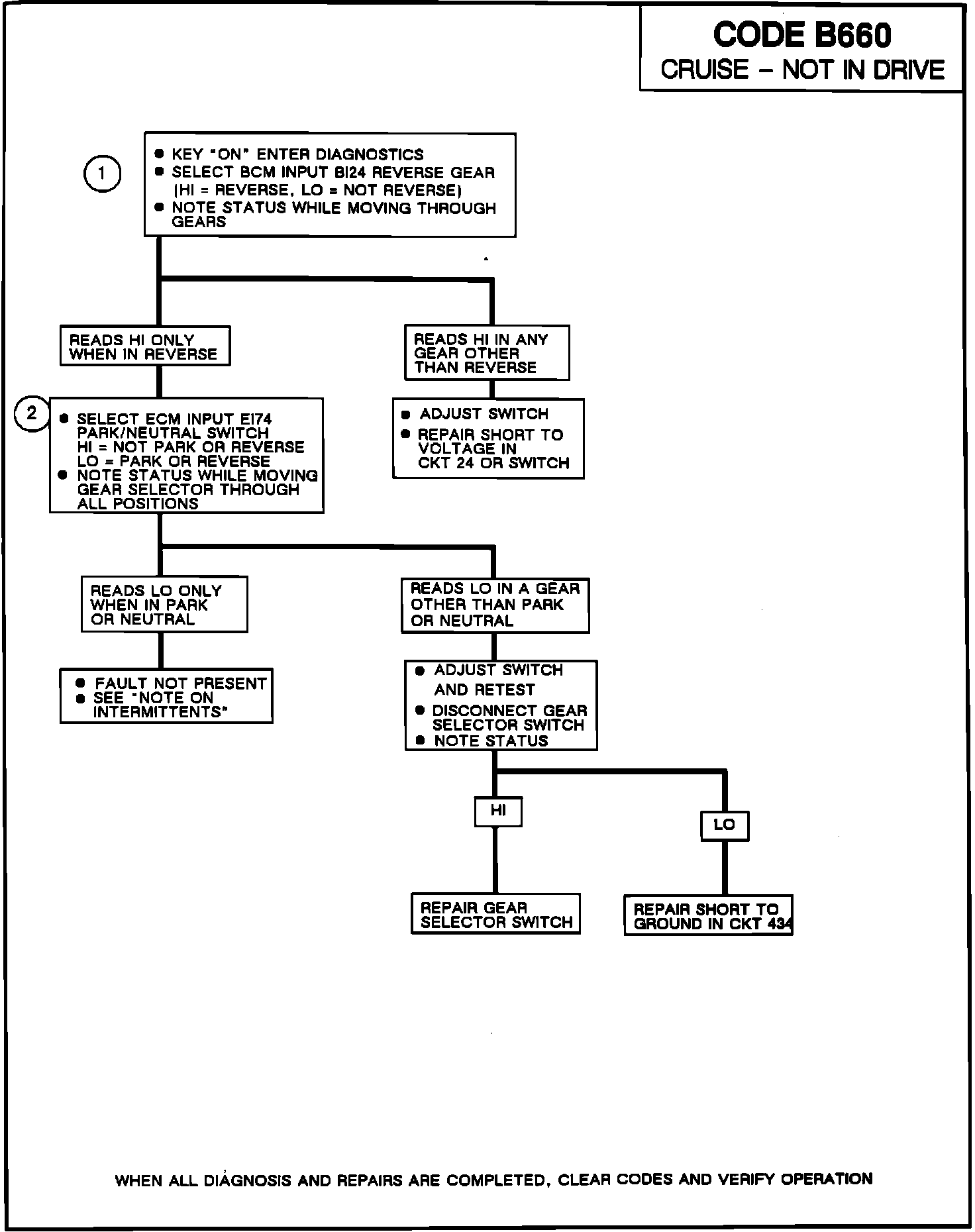 Code B660 will set if the cruise control is engaged and the BCM detects that the gear selector is in Park, Reverse, or Neutral. This is done by the BCM based on the ECM's input for park and neutral and by CKT 24 feeding directly to the BCM for reverse gear status ("HI" on CKT 24 indicates Reverse). During the time the failure is present, the BCM will disengage the cruise control.