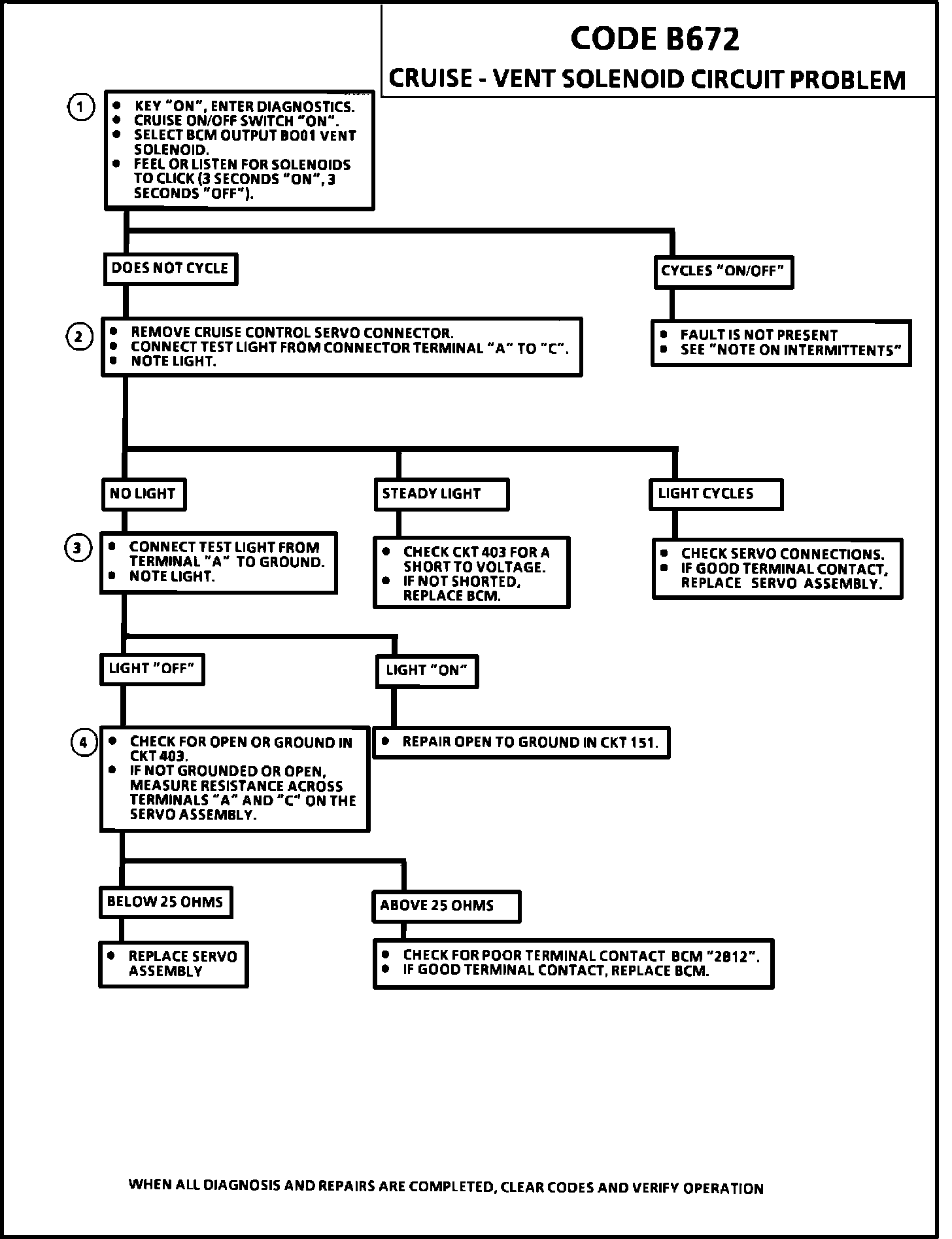 Code B672 will set if the cruise is on, the brake is not depressed and the BCM output is "HI" when it should be "LO" or "LO" when it should be "HI." Under this condition, the BCM will disable the cruise control until the BCM sees the proper output signal. These determinations are made on the circuitry internal to the BCM and may not affect the "HI" or "LO" displayed during service mode, as they only indicate what the BCM wants the output signal at, not what it is actually at. An output display of "LO" means CKT 403 should be de-energized (vent solenoid off and an output display of "HI" means CKT 403 should be energized (vent solenoid "ON").
