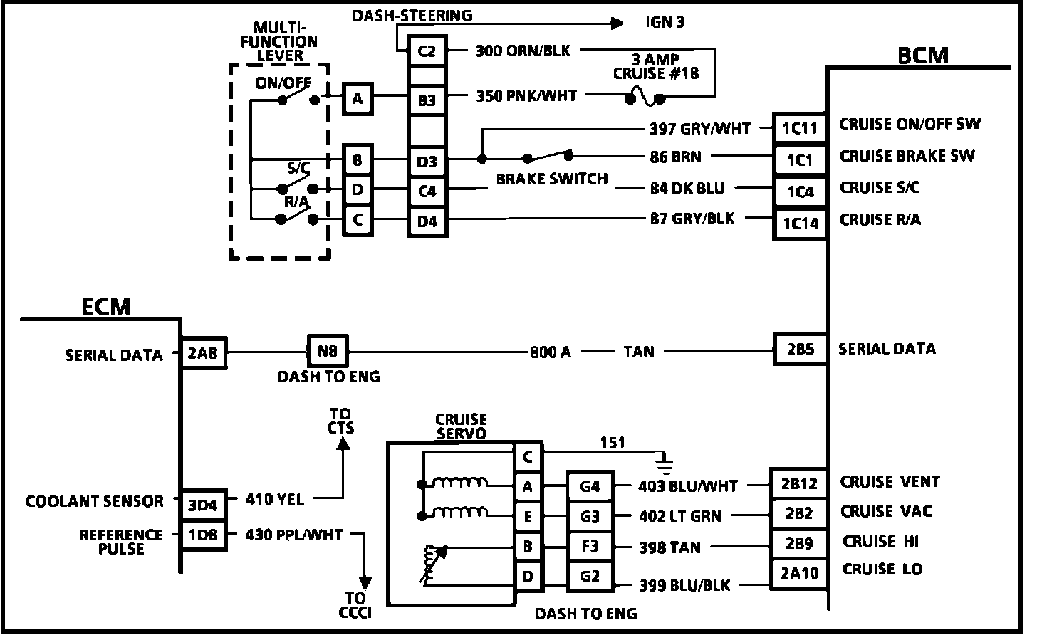 The cruise control vent solenoid receives a rapidly switched voltage signal from the BCM to control the amount of time the solenoid is energized. During the time the output is "HI" the solenoid is energized and vacuum is not vented (or it is trapped) in the servo.