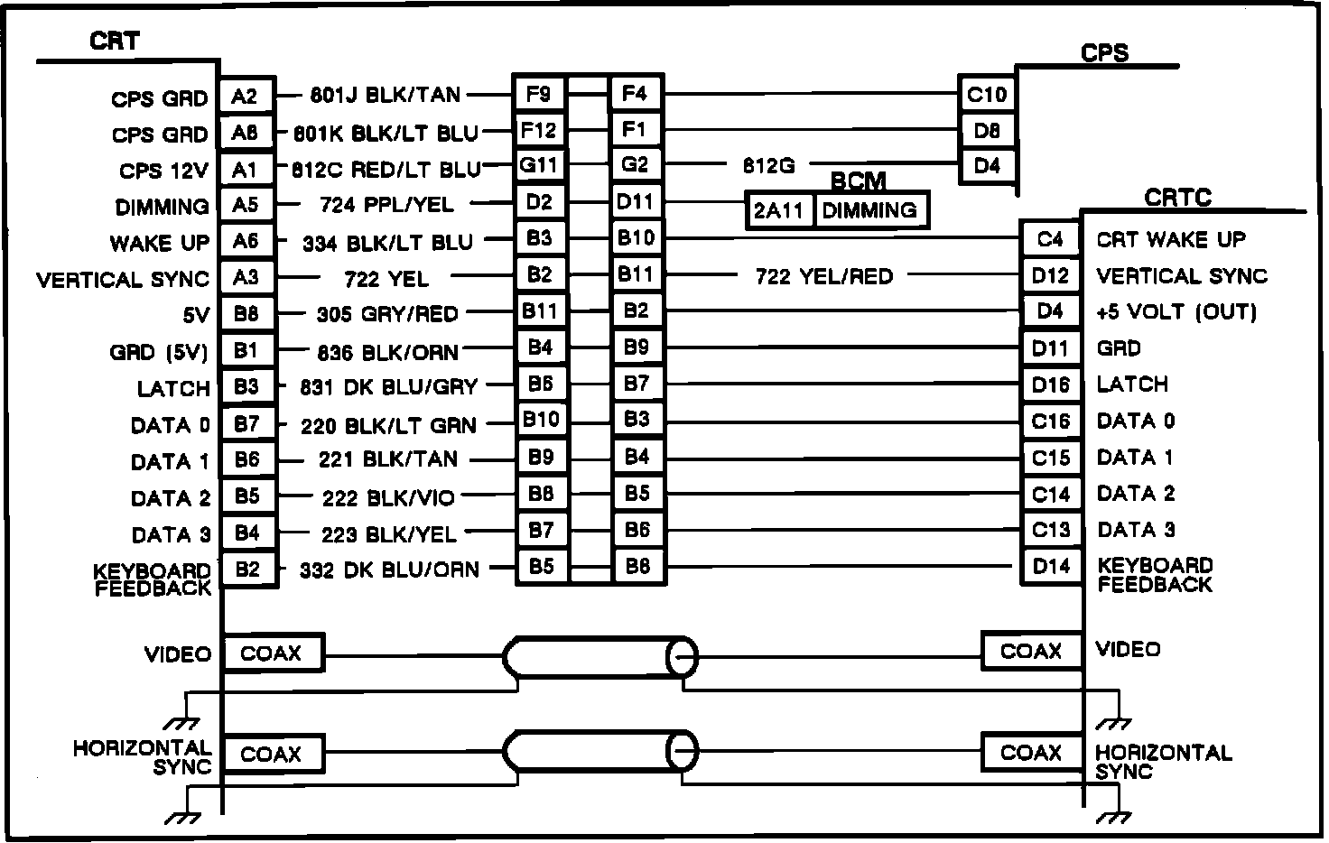 This code indicates there is an intermittent problem with the CRT's switches circuits. If the fault was present, you would not be able to enter diagnostics to see this code. If this code is set, there is an intermittent problem within the 4 data circuits, the keyboard feedback circuit, or the 5.0 volt power or ground circuit. Manipulate these circuits while checking continuity, or by using tester J34914. Since the intermittent problem is the switches not responding, continually select different switches while manipulating circuits. When the failure occurs, the switches on the CRT will not work.