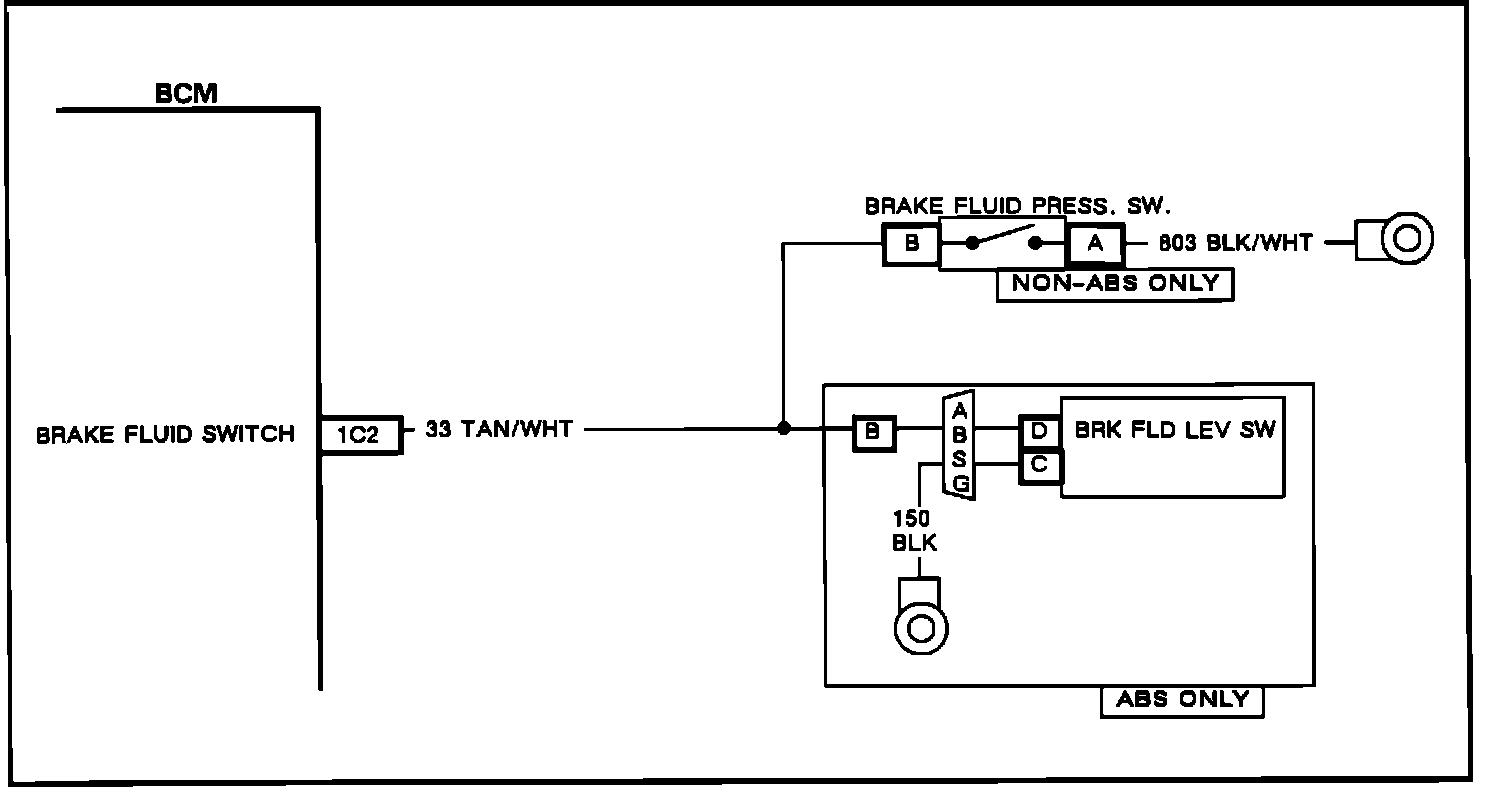 The BCM provides system voltage to the brake fluid level circuit, and the brake fluid level switch provides the single path to ground. The BCM supplies and internally monitors the voltage level of the circuit at pin 1C2. When the brake fluid level circuit is open the BCM detects system voltage, but if the brake fluid level switch provides a path to ground (low brake fluid level in the reservoir), the BCM will detect low voltage. Once the BCM has determined that all the of the failure conditions have been met, it will send the "BRAKE FLUID LOW" message to the IPC. The BCM will also illuminate the "BRAKE" indicator on the IPC and will activate the fast paced chime on the chime module.