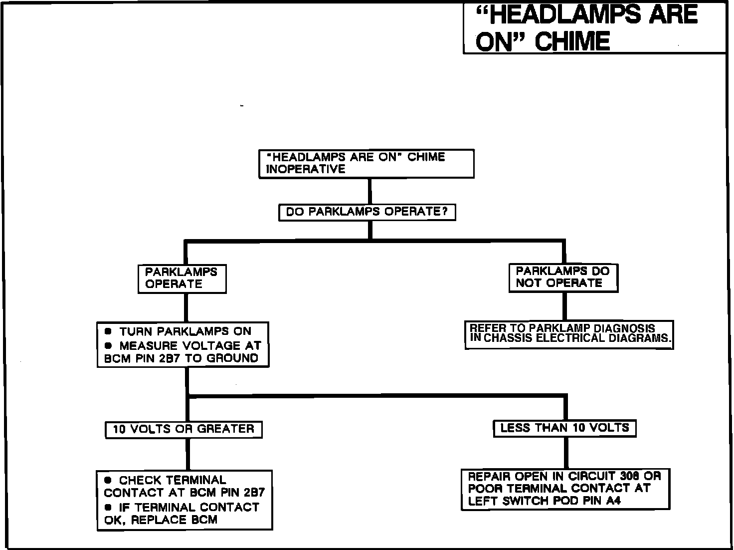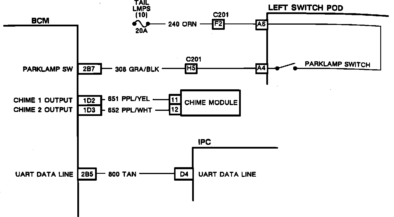 The Park Light fuse #10 provides system voltage to the park light switch in the left switch pod. When the parklamp switch is closed, it sends voltage to the BCM. The BCM internally monitors the voltage level of the park light circuit at pin 1D6. When the parklamp switch is open the BCM will detect 0 volts, but if the park light switch is closed (the parklamps/headlamps are turned "ON"), the BCM will detect system voltage at pin 1D6. Once the BCM has determined that all of the failure conditions have been met, it will turn "ON" the fast paced chime on the chime module and the "LIGHTS ON" indicator on the IPC.