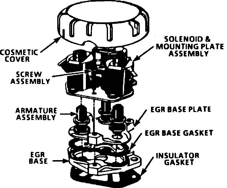 The flow accuracy is dependent on the orifice size only, which results in improved control. The swivel pintle feature insures good sealing of the exhaust gas flow, reducing the need for critical assembly alignment. The effects of EGR leakage on idle quality are reduced because the shaft and seals are exposed to the exhaust pressure instead of manifold vacuum. The shafts are sealed from the exhaust chamber by floating seals held in place by the seal spring. These springs also hold the upper seals of the armature cavity in the solenoids.