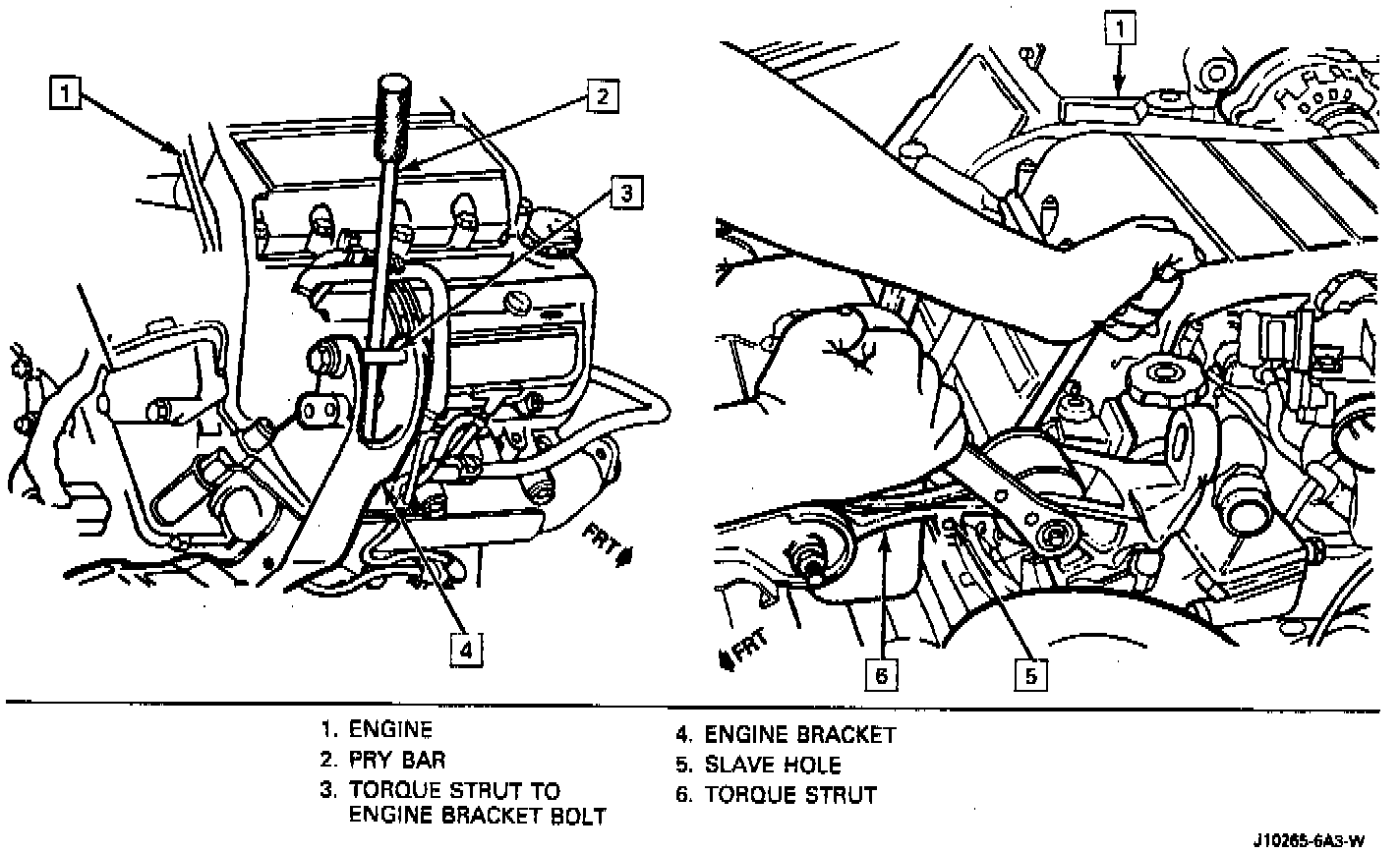 1. Pulling forward on pry bar to relieve engine weight, remove driver side torque strut to engine bracket bolt from torque strut slave hole and engine bracket.