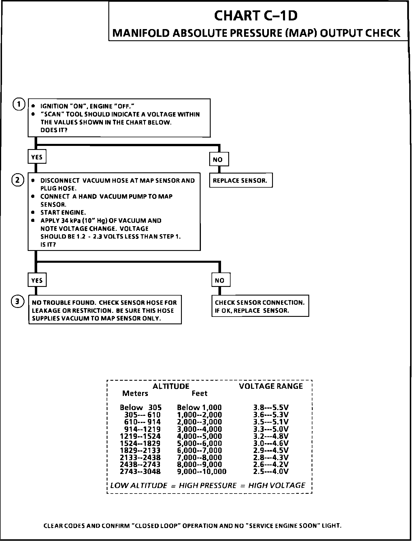 1. Checks MAP sensor output voltage to the ECM. This voltage, without engine running, represents a barometer reading to the ECM.