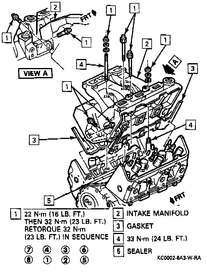 1. Place a bead of GM RTV sealer (pin 1052917) or equivalent on each ridge where the front and rear of the intake manifold contact the block