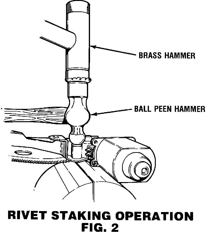 5. Position new motor to the regulator backplate and with the aid of a helper, install motor with 1 rivet (bottom location, Figure 1) by collapsing or crushing end of rivet (P/N 9441949) with a ball peen type hammer as shown in Figure 2.