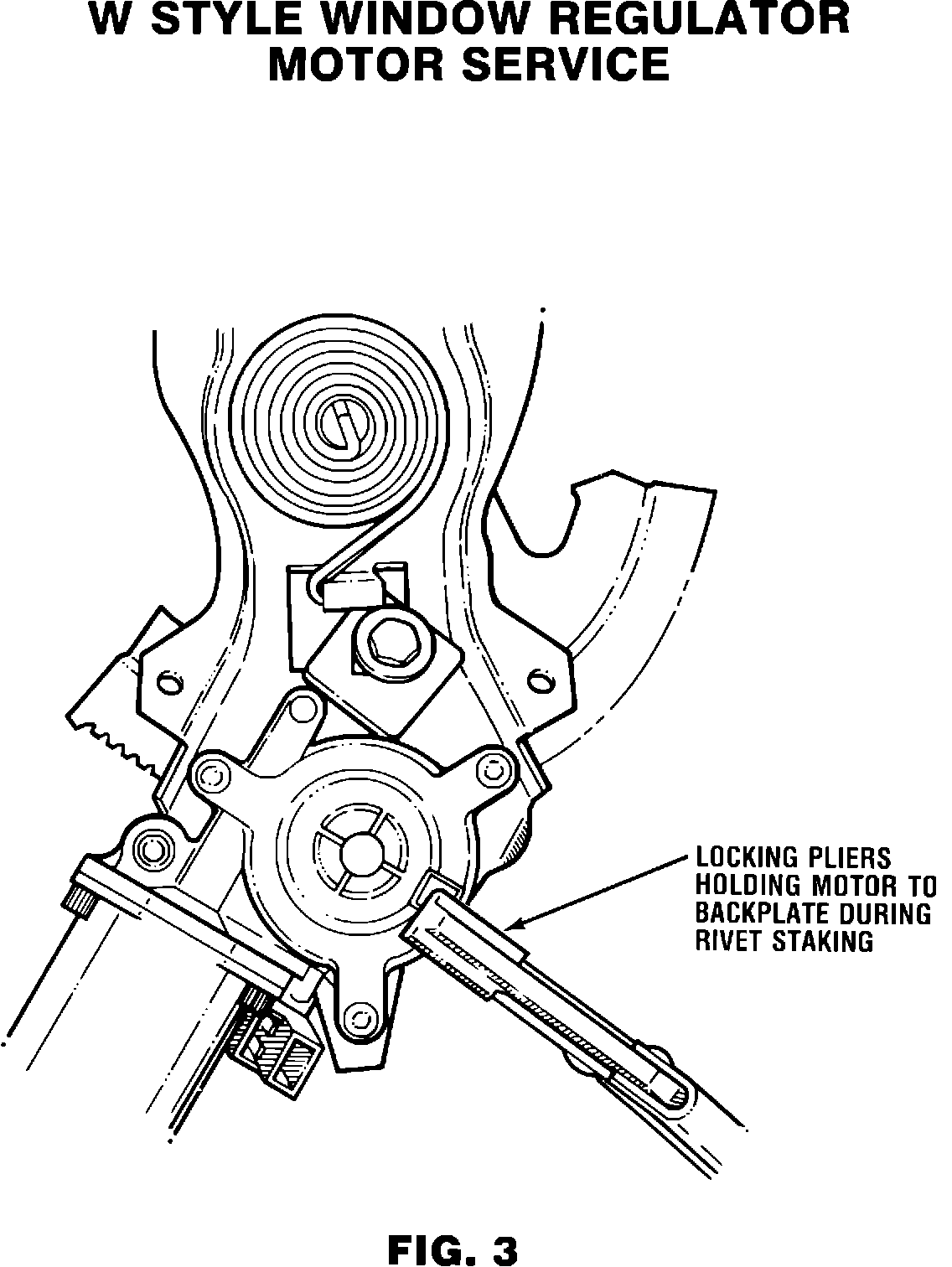 STEP 2 MUST BE PERFORMED WHEN REGULATOR IS REMOVED FROM DOOR. THE REGULATOR LIFT ARM IS UNDER TENSION FROM THE COUNTERBALANCE SPRING AND CAN CAUSE PERSONAL INJURY IF THE MOTOR IS REMOVED WITHOUT LOCKING THE SECTOR GEAR IN POSITION.
