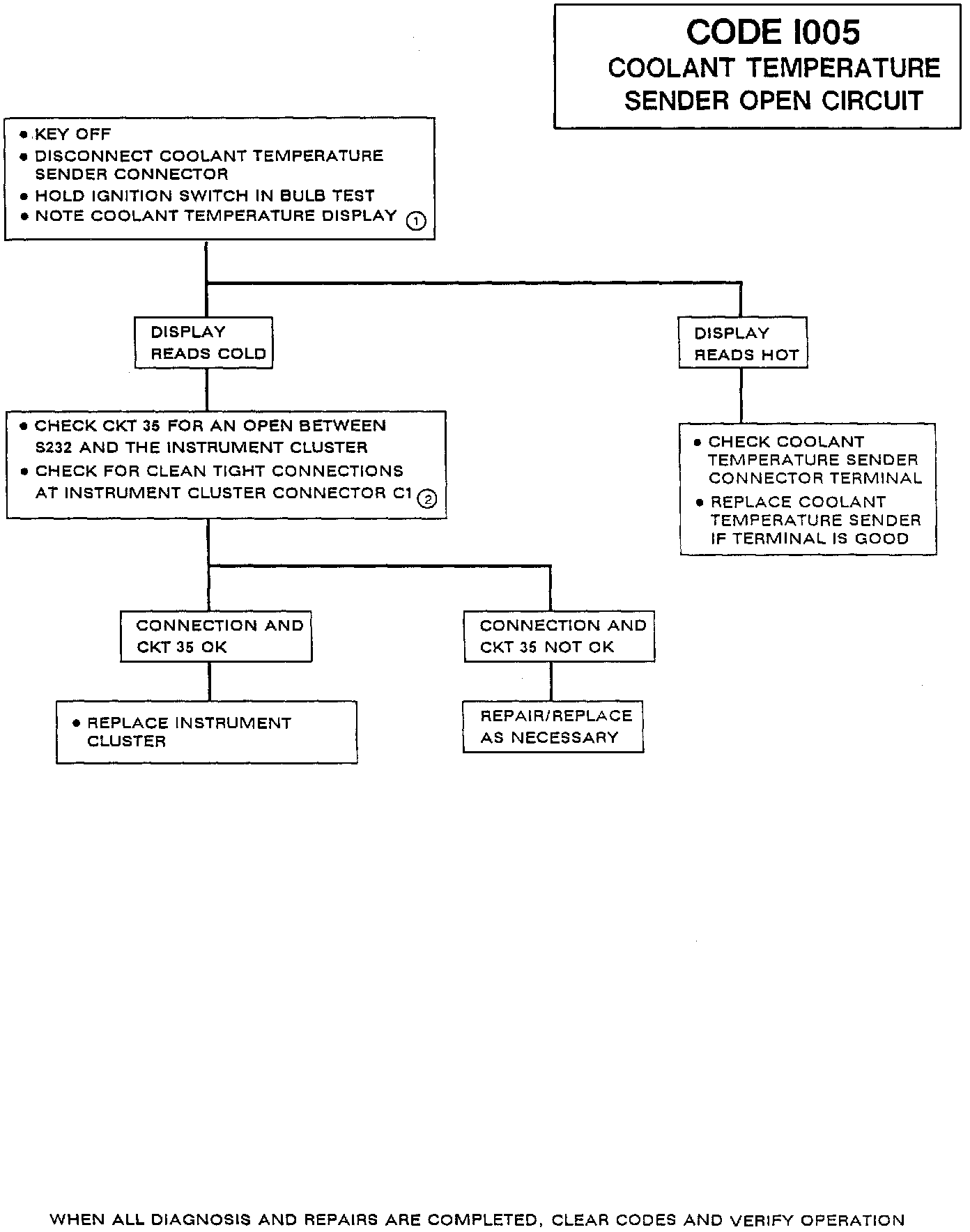 Code I005 will set if the Ignition is ON, the ECM Coolant Temperature Sender is greater than or equal to 100°F and sender resistance at the Instrument Cluster was at or above 2k ohms for 5 successive readings in a 2.5 second time period.