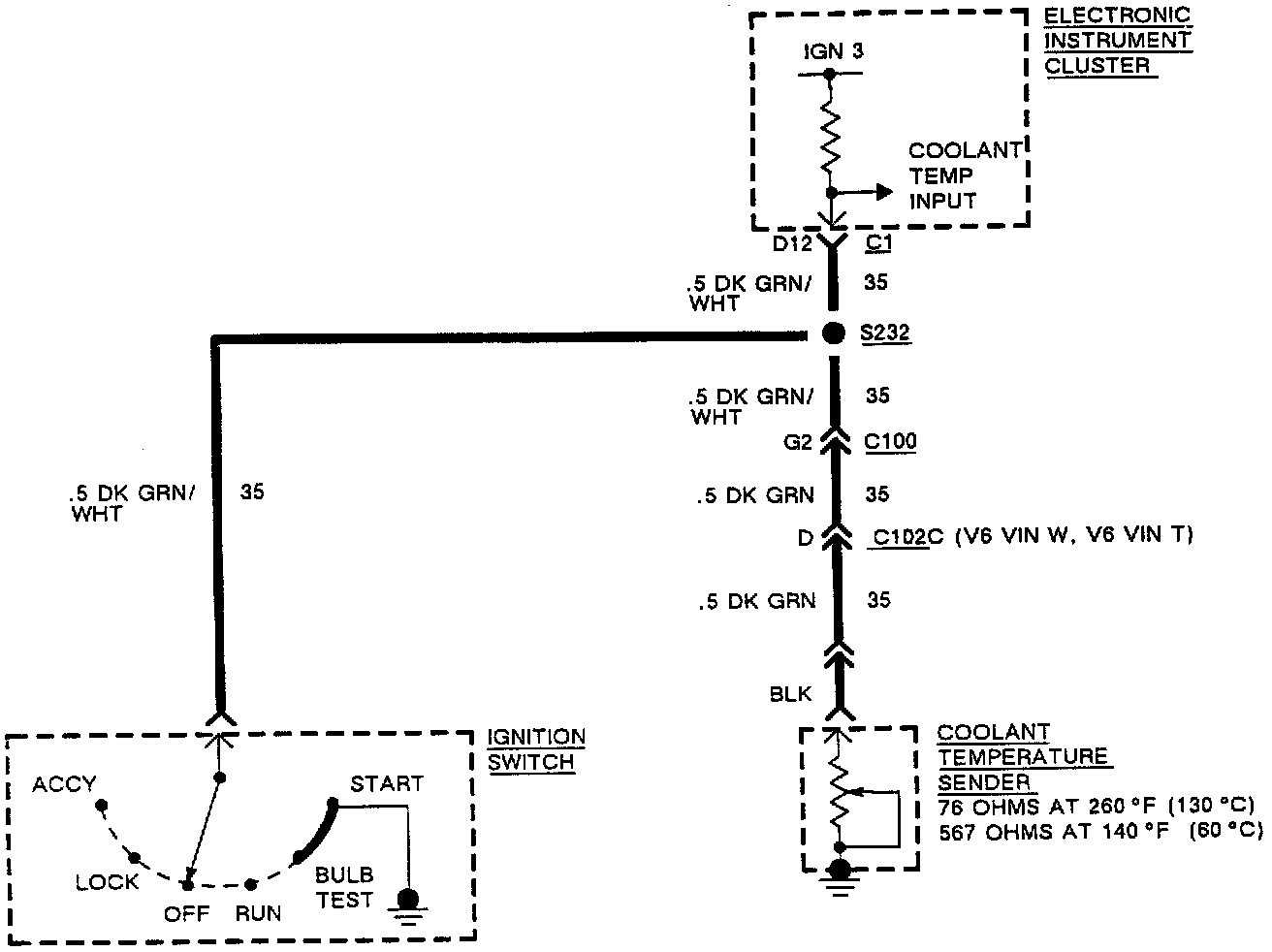 1. This step checks to see if the open is between the Coolant Temperature Sender and S232 or between S232 and the Instrument Cluster.