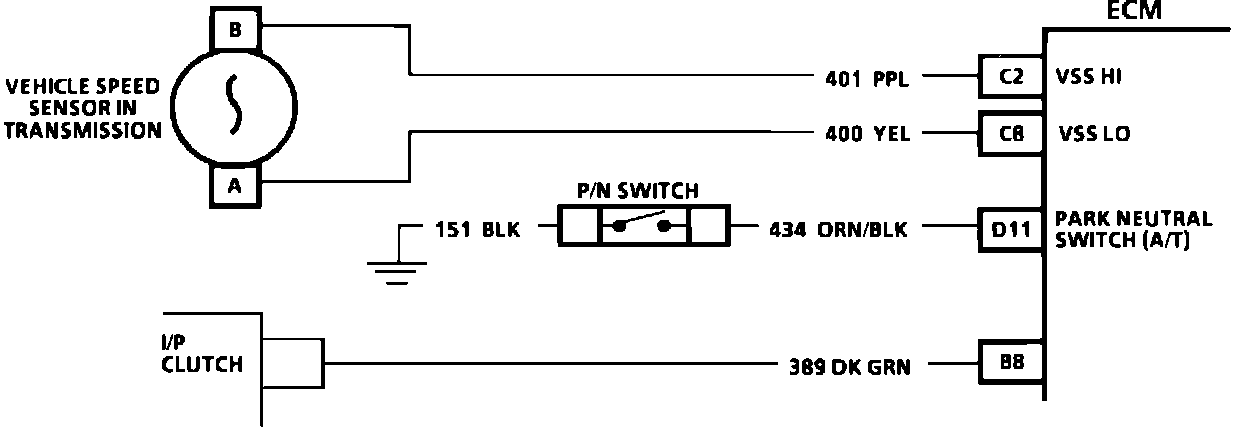 Vehicle speed information is provided to the ECM by the vehicle speed sensor which uses a permanent magnet (PM) generator and it is mounted in the transaxle. The PM generator produces a pulsing voltage whenever vehicle speed is over about 3 mph. The AC voltage level and the number of pulses increases with vehicle speed. The ECM then converts the pulsing voltage to mph which is used for calculations, and the mph can be displayed with a "Scan" tool. Output of the generator can also be seen by using a digital voltmeter on the AC scale while rotating the generator. The function of VSS buffer used in past model years has been incorporated into the ECM. The ECM then supplies the necessary signal for the instrument panel (4000 pulses per mile) for operating the speedometer and the odometer. If the vehicle is equipped with cruise control the ECM also provides a signal (2000 pulses per mile) to the cruise control module.