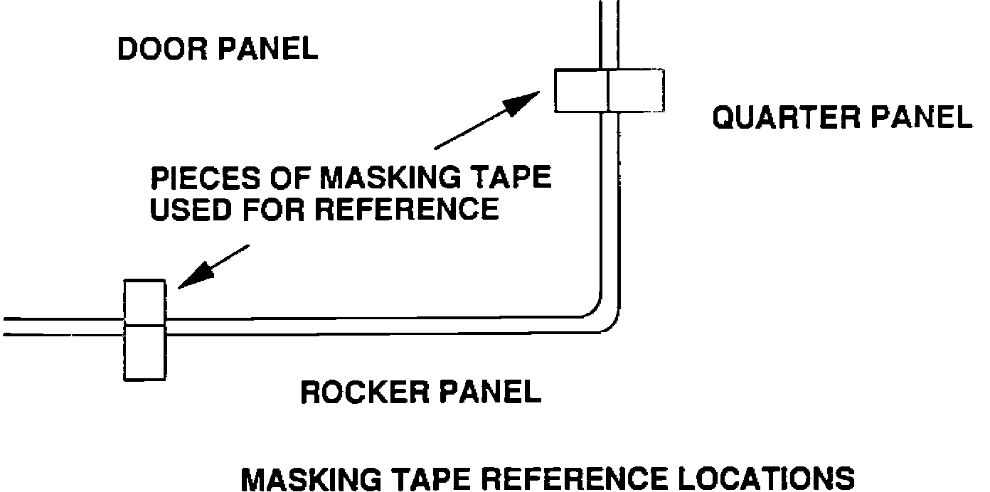 4. Using two pieces of masking tape, place one piece to bridge gap between door and rocker panel and second piece to bridge gap between door and quarter panel to act as reference points for door alignment (see illustration).