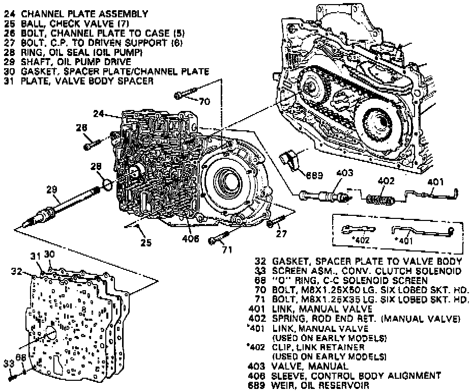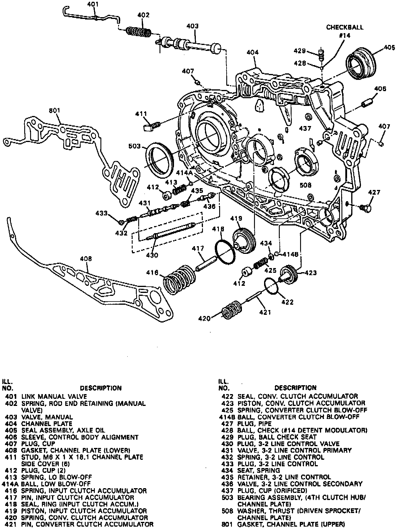 26. Remove eight check balls from channel plate, then withdraw converter clutch solenoid screen, Fig. 6. On early models, screen is located in valve body.