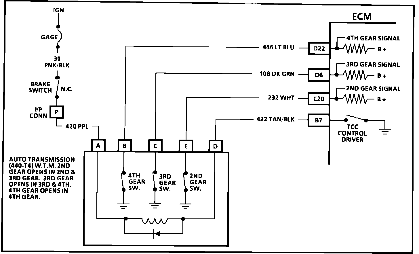 The 2nd gear switch in this vehicle is open in 3rd and 4th gear. The ECM uses this signal to disengage the TCC when going into a downshift.