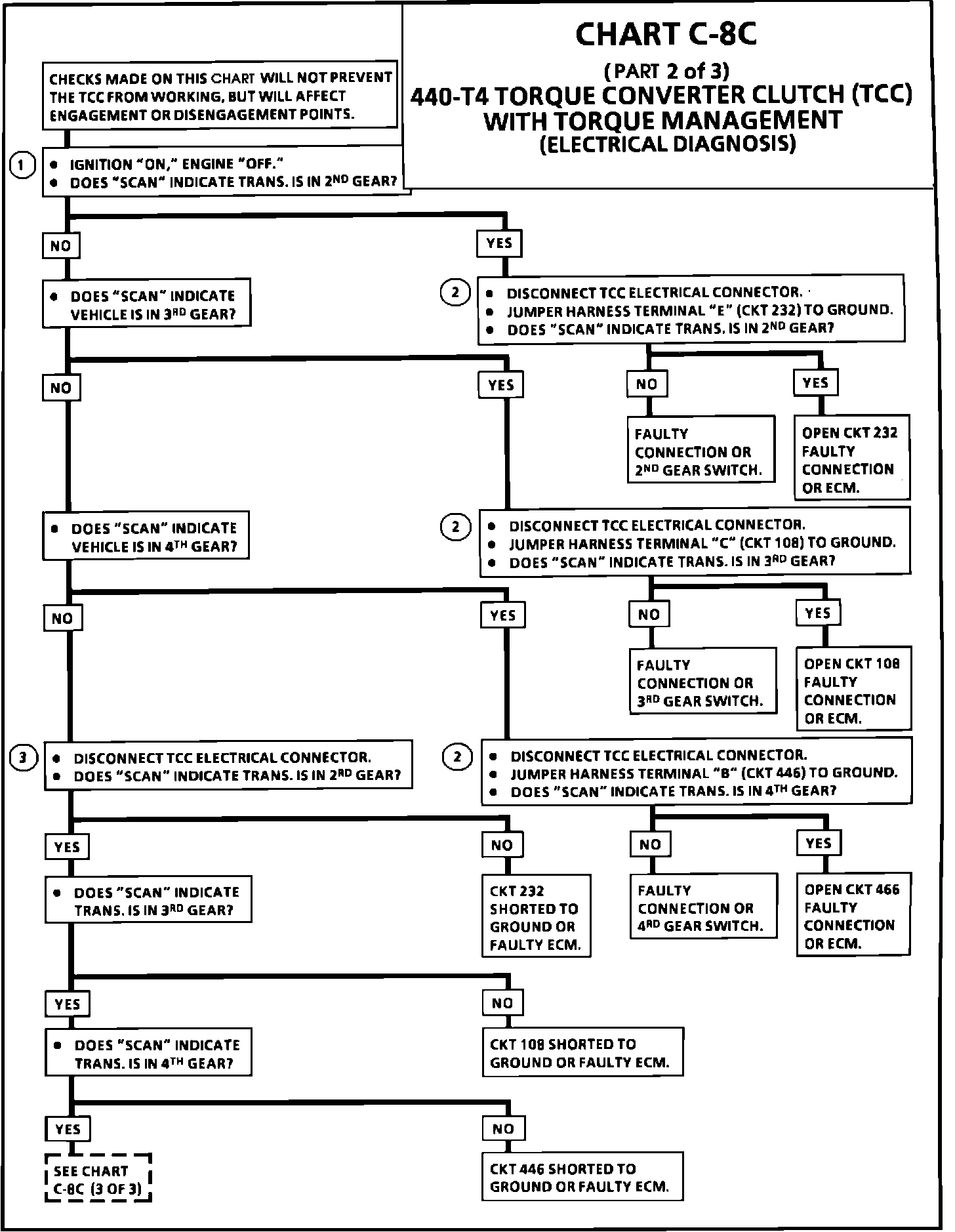 2. Determines whether the switch or signal circuit is open. The circuit can be checked for an open by measuring the voltage (with a voltmeter) at the TCC connector. Should be about 12 volts.