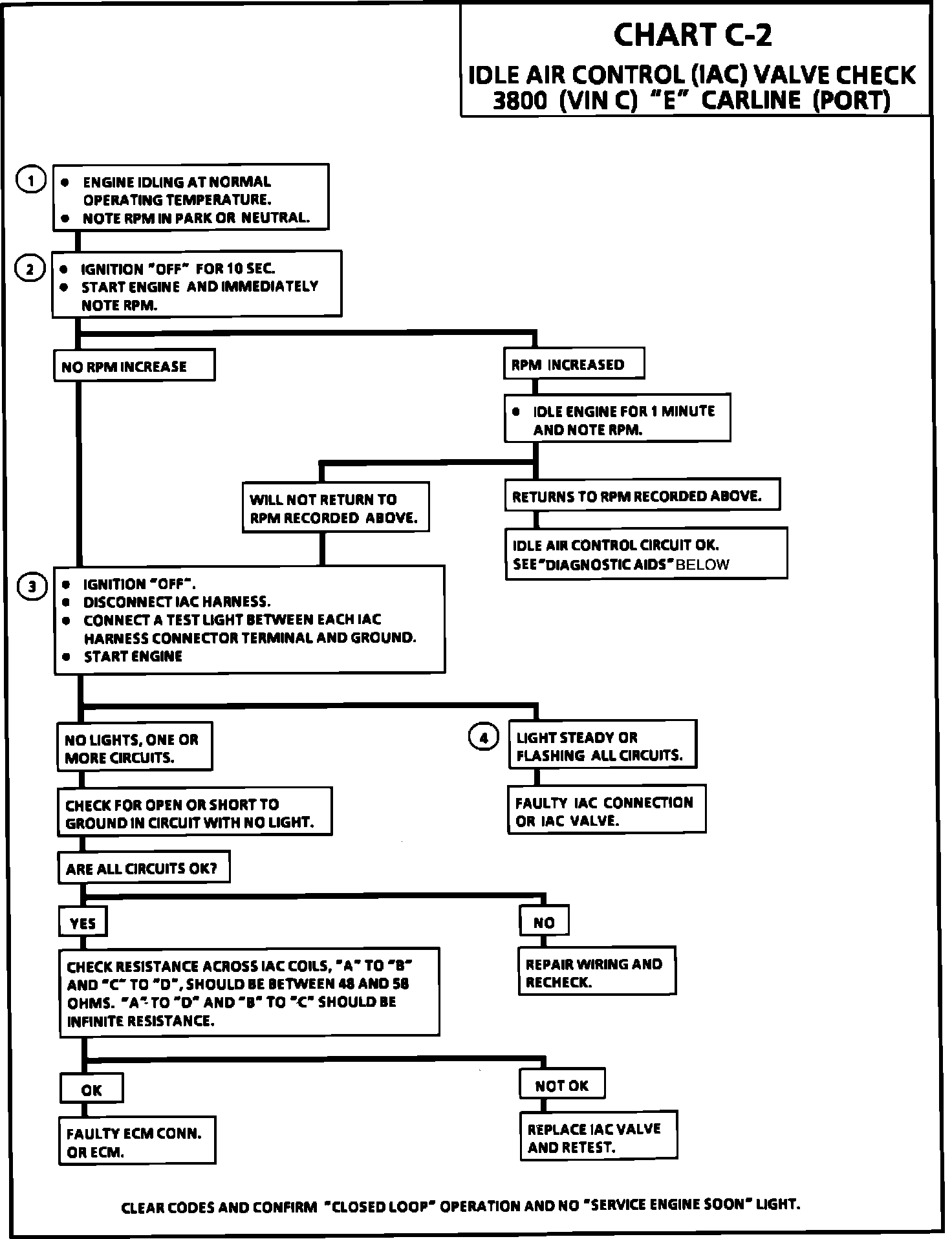 3. Be sure to disconnect the IAC motor prior to this test. The test light will confirm the ECM signals by a steady or flashing light on all circuits.