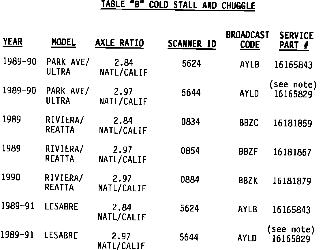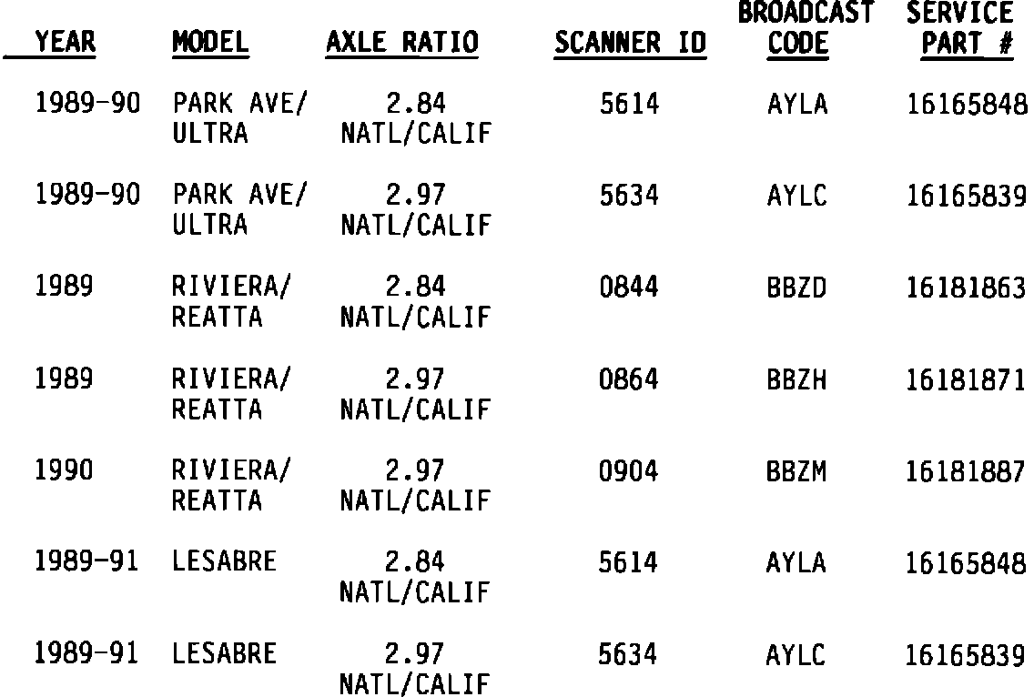 Some 1991 LeSabre models with a 2.84 axle ratio and Federal emissions package had a PROM released that used Scanner ID 5644 but had a broadcast code of AWJD. This should not be confused with 16165829 PROM which uses Scanner ID 5644 for a 2.97 axle ratio. DO NOT rely on the Scanner ID to determine which PROM is in a vehicle. Look at the broadcast code on the PROM to be sure.