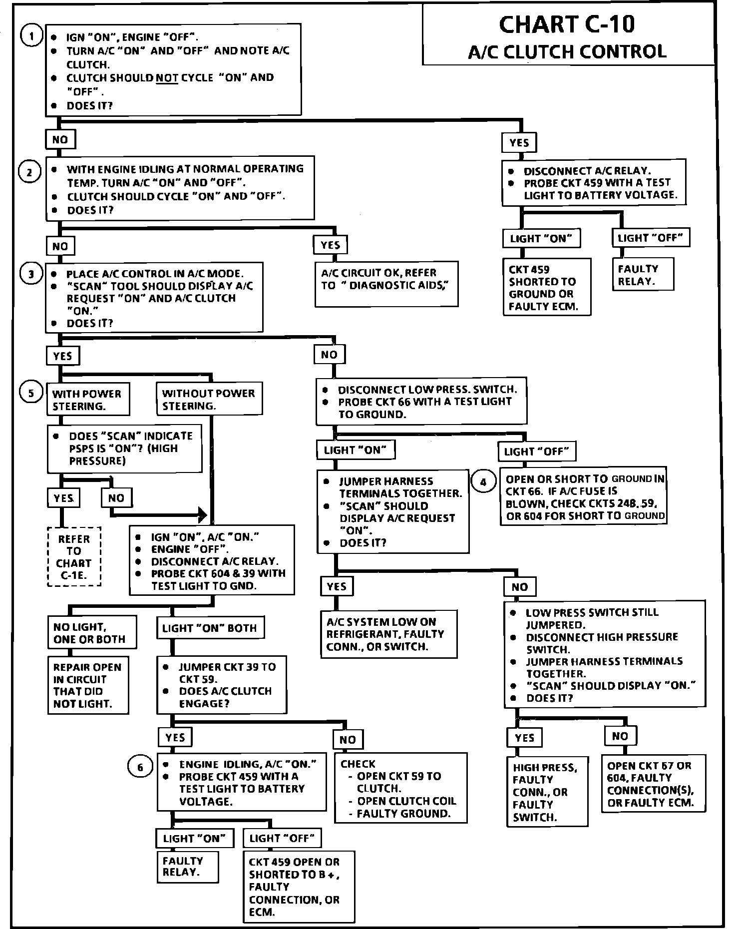 4. A short to ground in any part of the A/C request, circuit 67, circuit 59 to the A/C clutch, or clutch control circuit may be the cause of a blown fuse.