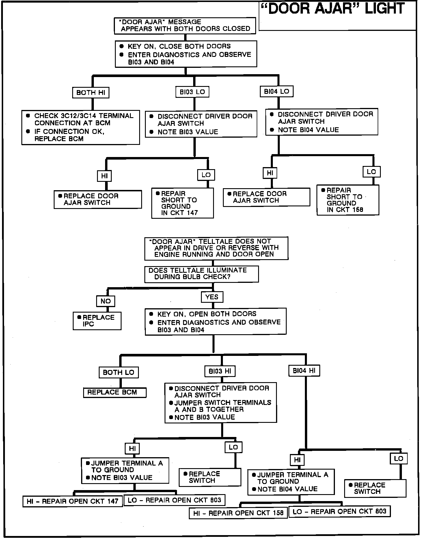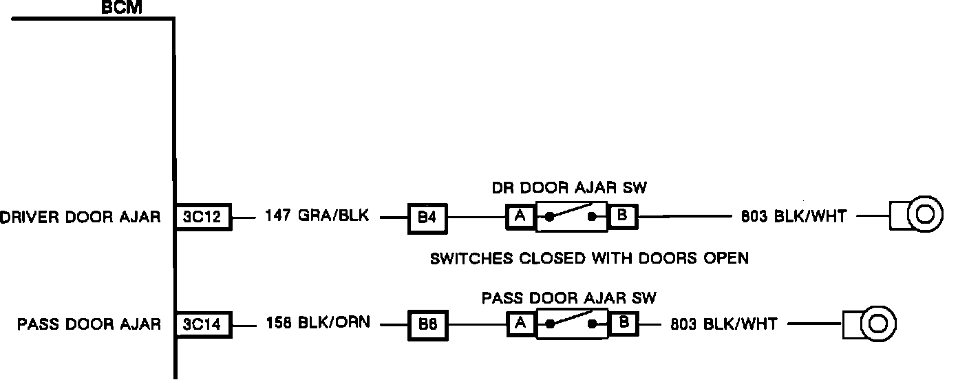 The BCM provides system voltage to the driver door ajar circuit, and the door ajar switch provides the single path to ground. The BCM supplies and internally monitors the voltage level of the circuit at pin 3C12/3C14. When the door ajar circuit is open the BCM will detect system voltage, but if the door ajar switch provides a path to ground (door open), the BCM will detect the circuit has been grounded. Once the BCM has determined that all of the failure conditions have been met, it will instruct the IPC to display the "DOOR AJAR" light.