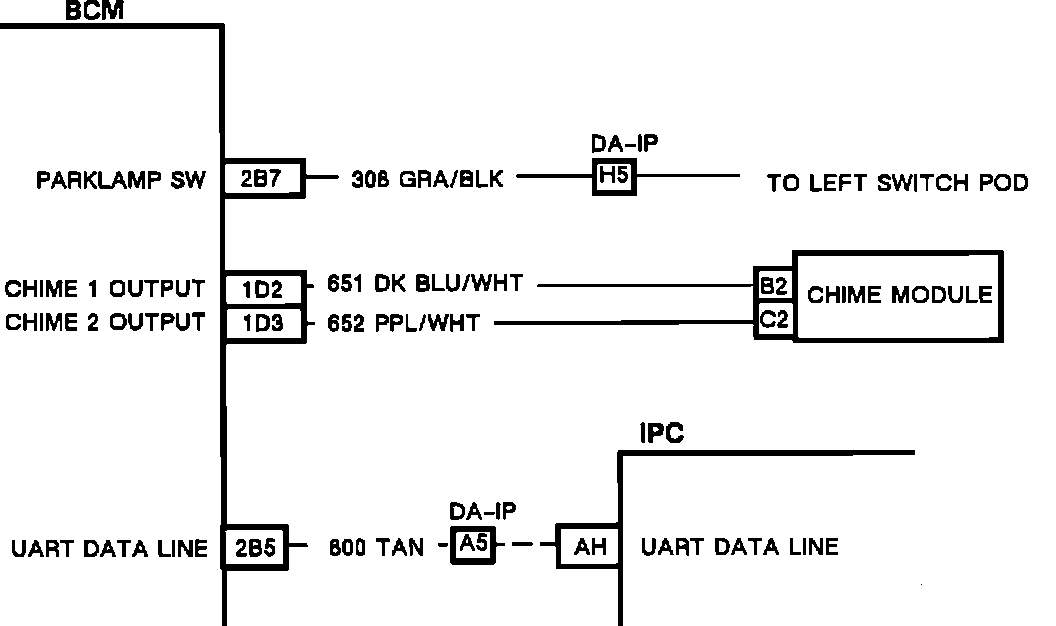The Park Light fuse #10 provides system voltage to the park light switch in the left switch pod. When the parklamp switch is closed, it sends voltage to the BCM. The BCM internally monitors the voltage level of the park light circuit at pin 2B7. When the parklamp switch is open the BCM will detect 0 volts, but if the park light switch is closed (the parklamps/headlamps are turned "ON"), the BCM will detect system voltage at pin 2B7. Once the BCM has determined that all of the failure conditions have been met, it will turn "ON" the fast paced chime on the chime module and the "LIGHTS ON" indicator on the IPC.
