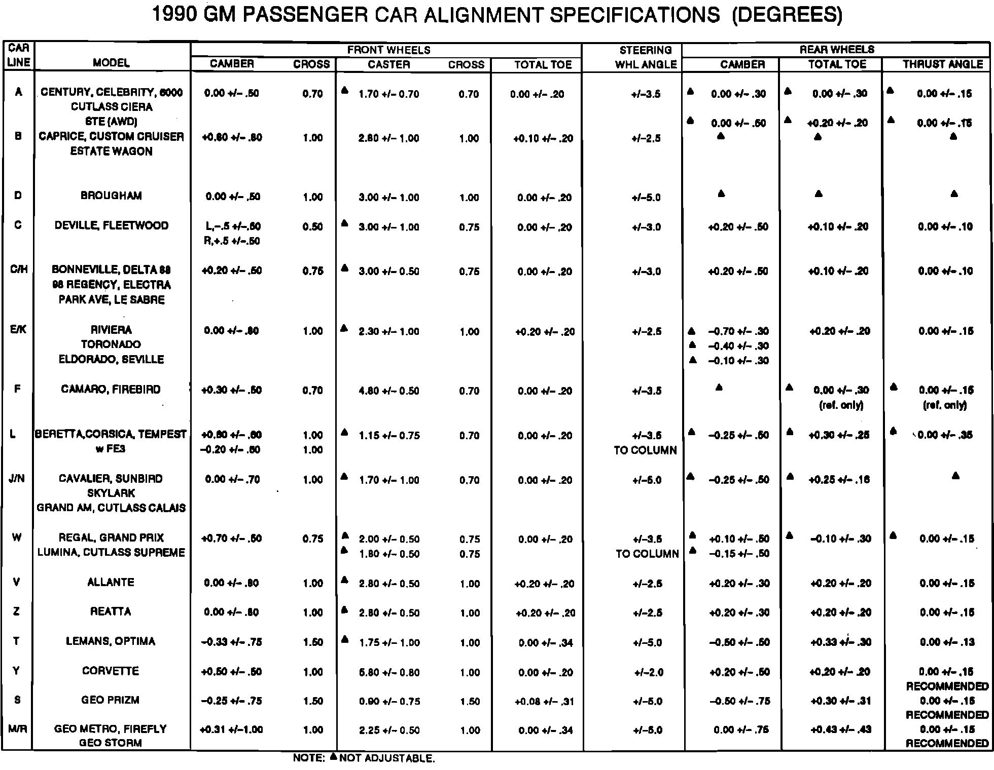 Illustrated for your information are the 1990 model wheel alignment specifications for all GM passenger cars.