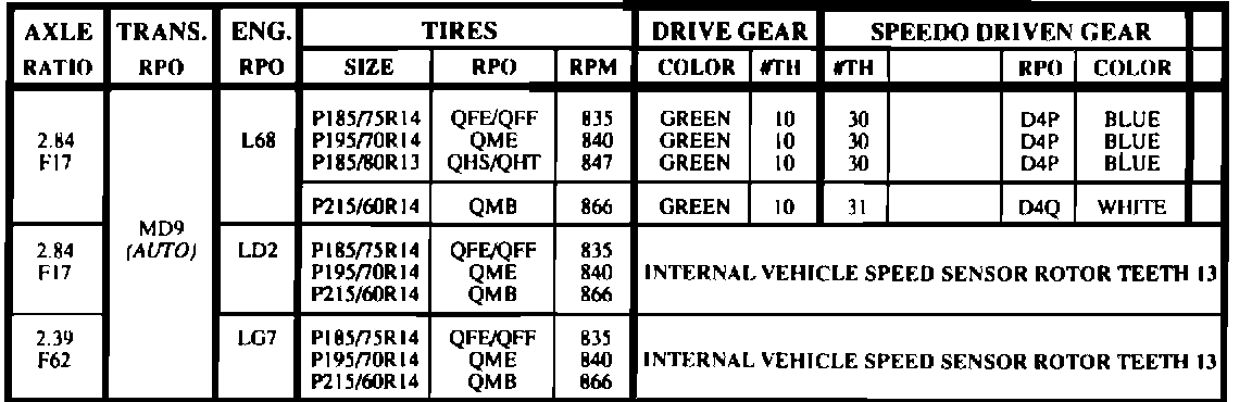 The following chart has been updated and replaces the speedometer gear chart shown in Section 7A of the 1990 Buick Skylark Service Manual, Page 7A-35.