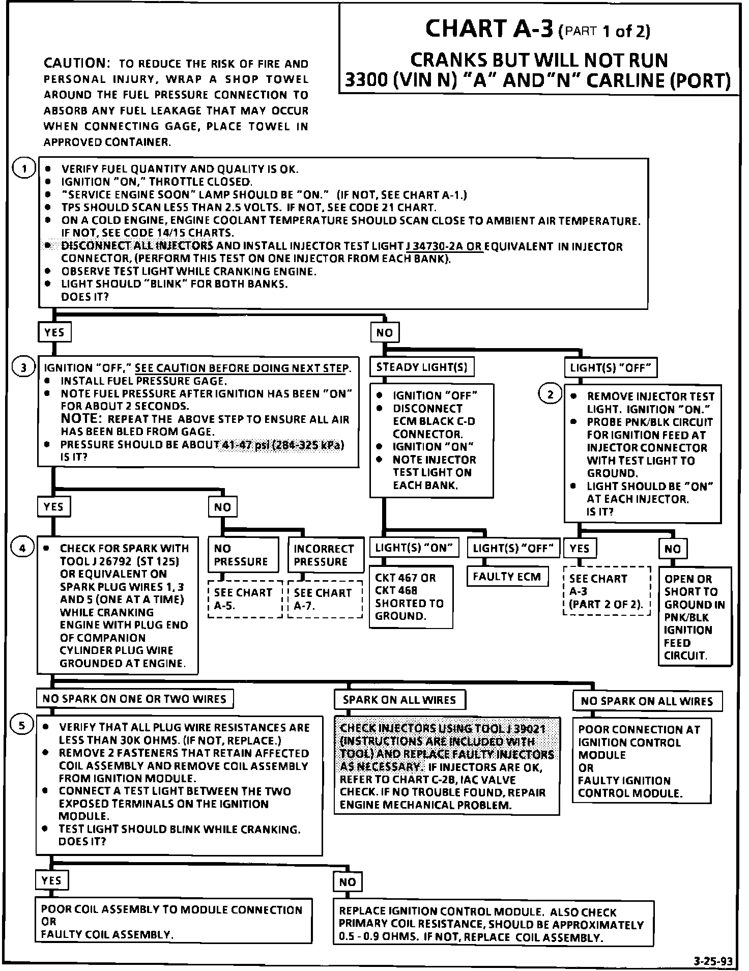 This bulletin updates Chart A-3, "Engine Cranks But Will Not Run" (Part 1 of 2) in Section 6E3, "Driveability and Emissions" for the 1989, 1990 and 1991 Century and Skylarks equipped with the 3300 (VIN N) engine. The revised chart directs that all injectors be disconnected, allowing diagnosis of a "Cranks But Will Not Run" condition caused by a shorted injector coil.