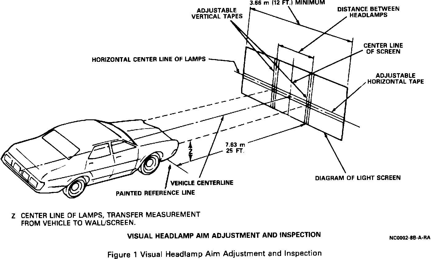 Headlamp Aiming By The Screen Method - First, position the vehicle so that it is square with the screen and with the front of the headlamps directly over a reference line which has been painted on the floor.