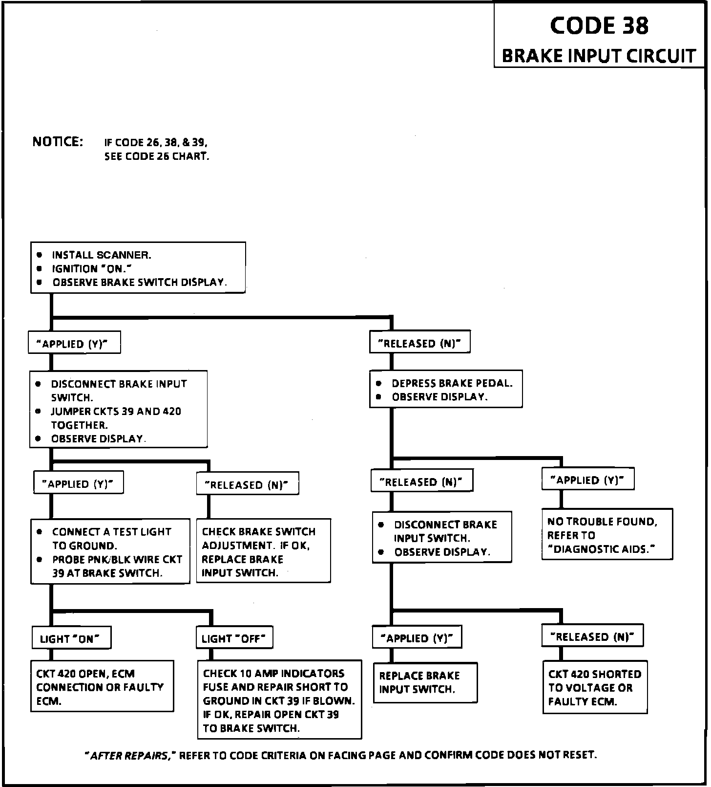 A Code 38 in combination with a Code 39 would mean a problem with one or more of the following components. Fuse, CKT 639, brake switch or wire before the splice.