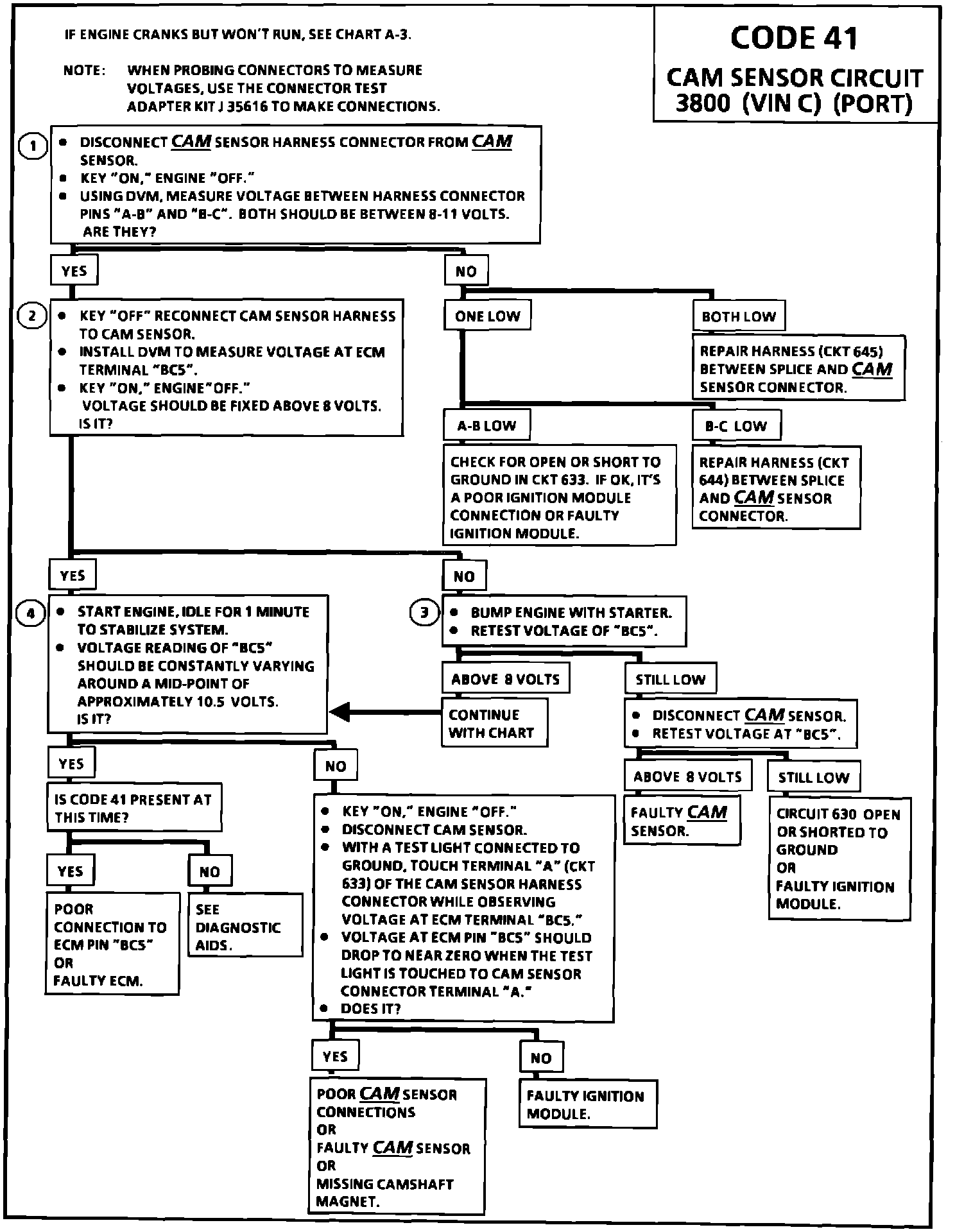 Code 41 is set when the following condition is met: Engine is running and a cam sensor signal not received by ECM for last 2 seconds.