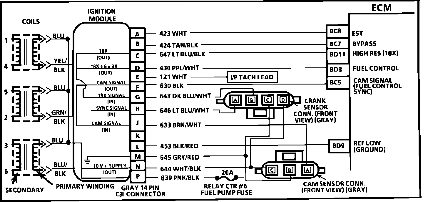 The cam sensor sends a signal (sync-pulse) to the ignition module when cylinder # 1 is 25 degrees after top dead center on the compression stroke. This signal is used to start sequential fuel injection with the proper cylinder. If the cam signal is lost to the ECM, the engines fuel delivery will switch back to the simultaneous mode of operations. THE ENGINE WILL CONTINUE TO RUN. IT WILL RESTART AFTER SHUT DOWN.