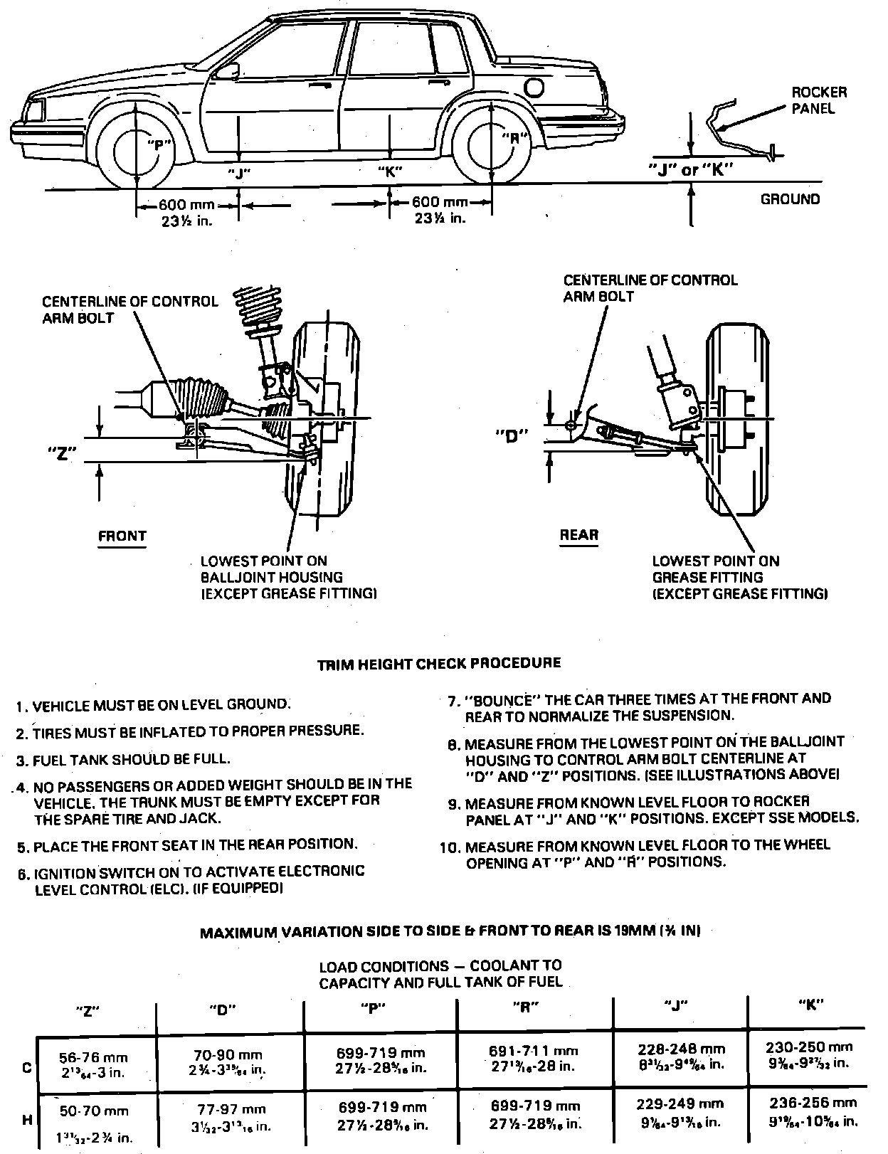 Trim heights are checked with tires at recommended pressure, fuel tank at capacity, front seat in rear position, no passengers and trunk empty, except for spare tire and jack.