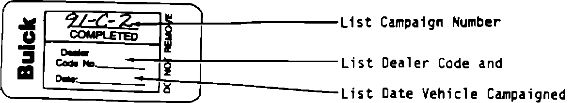 Each vehicle corrected in accordance with the instructions outlined in this bulletin will require a "Campaign Identification Label". Each label provides a space to include the five (5) digit dealer code of the dealer performing the campaign service. This information may be inserted with a typewriter or a ball-point pen.