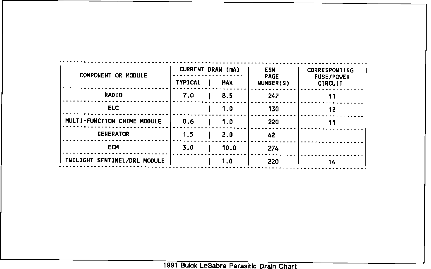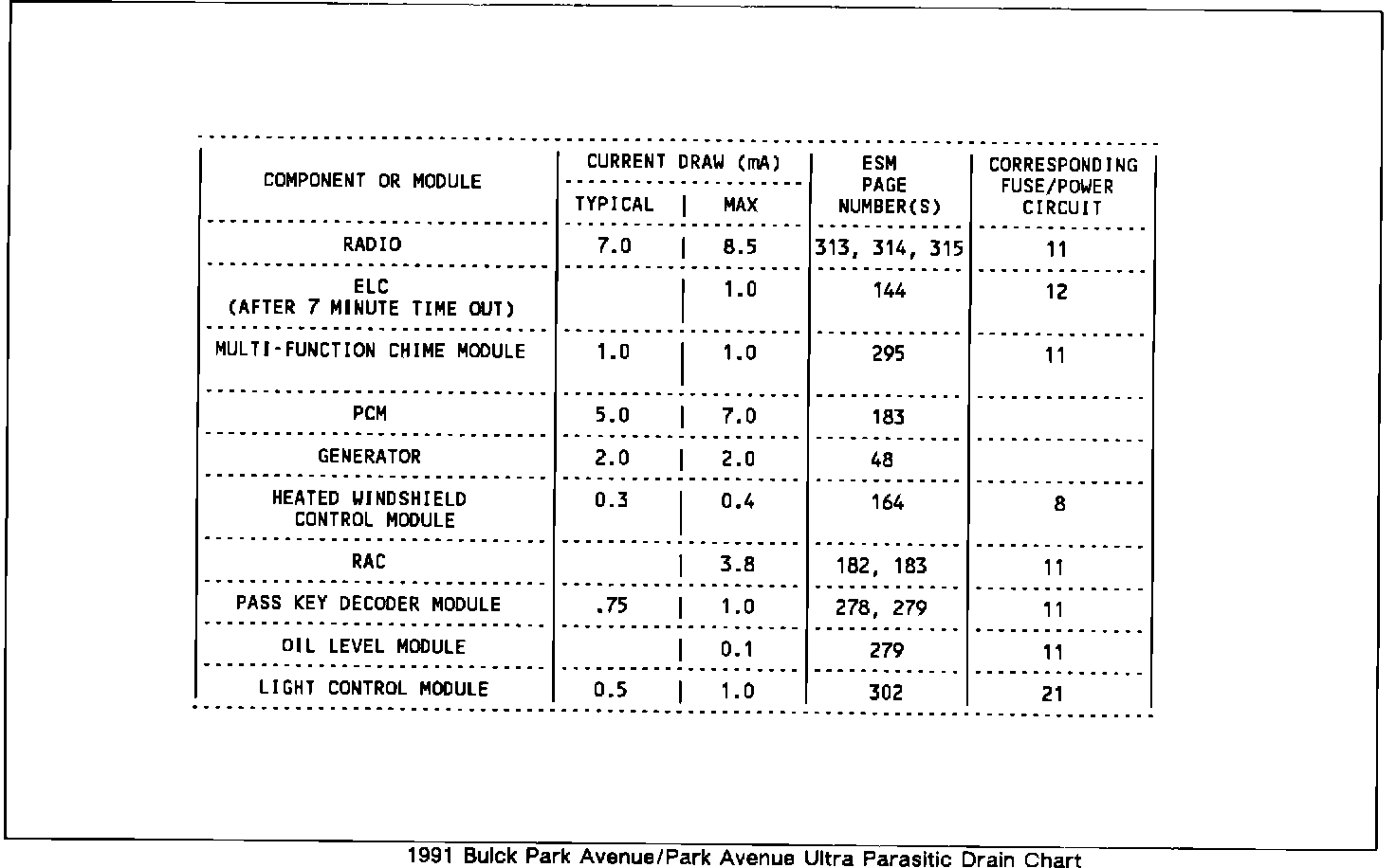 11. If current draw is above specifications listed in the Parasitic Drain Chart, remove system fuses one fuse at a time until the current draw returns to a value less than or equal to the specifications listed. Perform steps 8 through 10 each time a fuse is removed. Refer to ELECTRICAL DIAGNOSIS (SECTION 8A) in the applicable 1991 Oldsmobile Service Information Manual for specific circuit schematics.