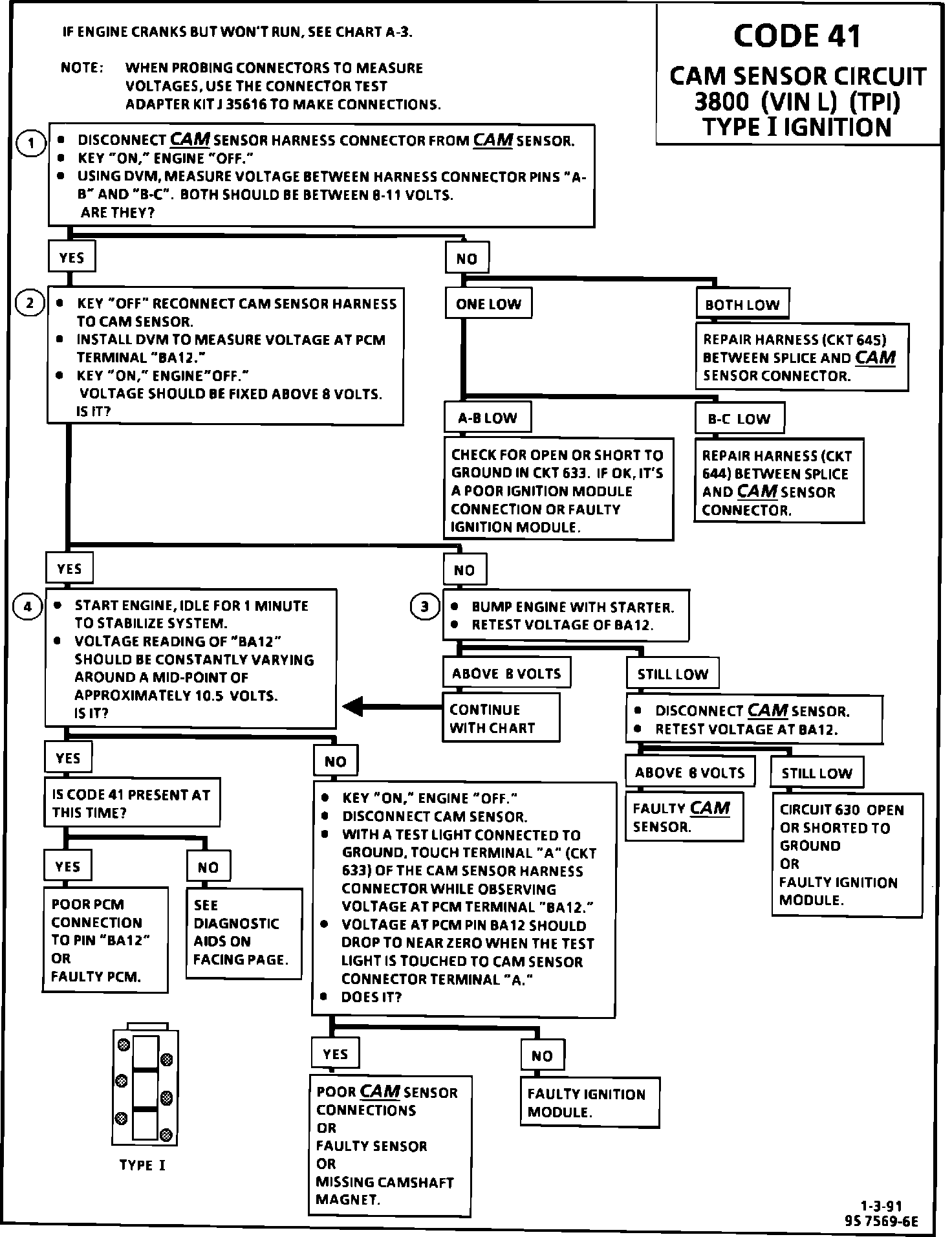 This bulletin updates the Code 41 Diagnostic Chart in "Driveability And Emissions" Section 6E3 for 1991 Park Avenue and Riviera/Reatta models equipped with the 3800 (VIN L) engine. The revised chart addresses the possibility of a faulty ignition module causing Code 41 to be set by not supplying the CAM Sensor signal to the PCM. Separate charts are included with this bulletin for "Type I" and "Type II" ignition modules. To ensure proper diagnosis and to avoid replacement of good parts, the type of system being diagnosed must be identified and the correct chart for the applicable system used.