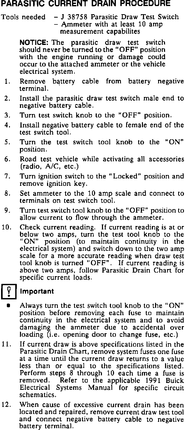 The revised Parasitic Current Drain Procedure for (Test A) found in LeSabre Electrical Systems Manual - page 44, and Park Avenue/Ultra Electrical Systems Manual - page 50.
