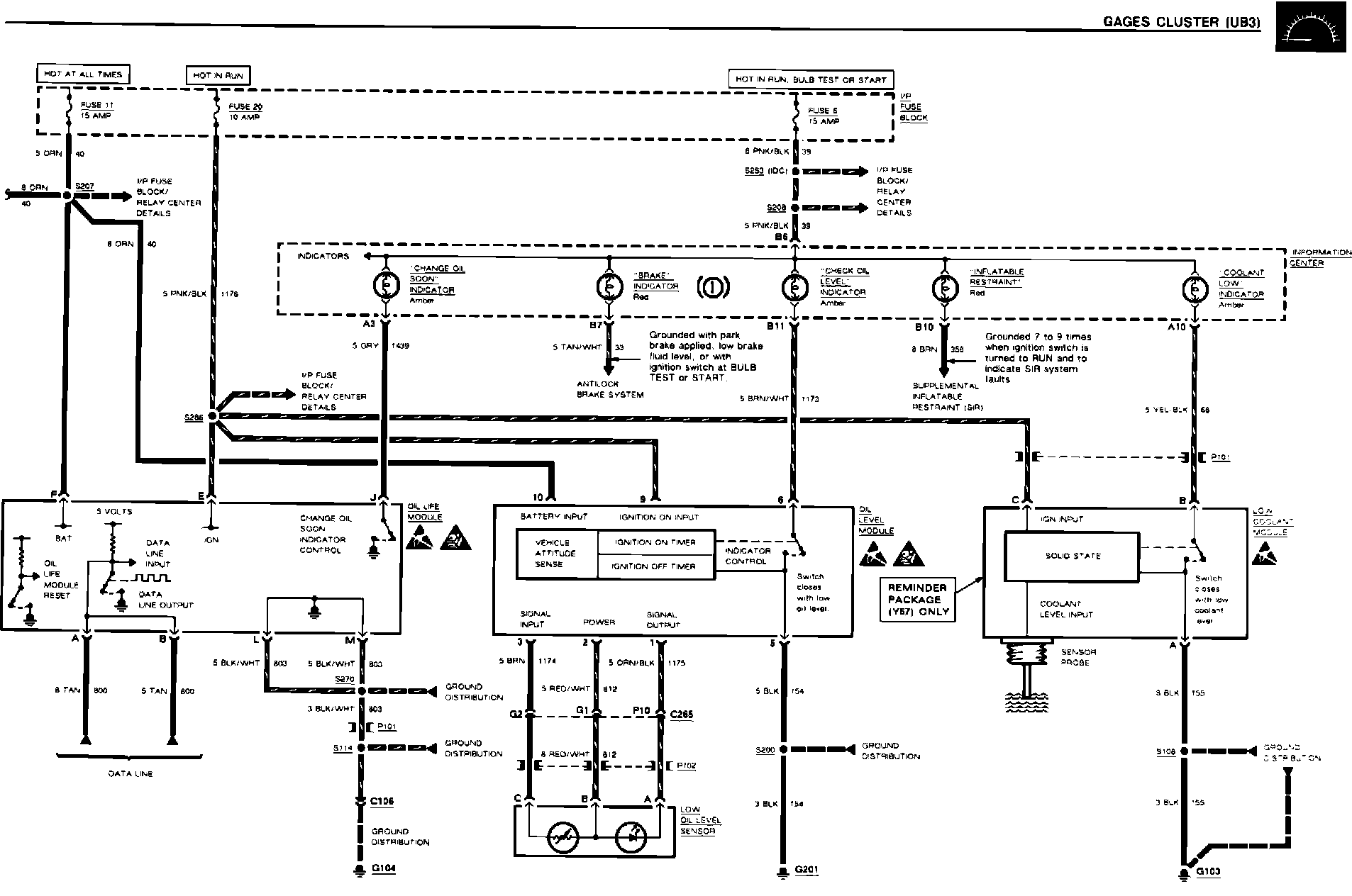 The illustrations contain revised information for: Gages Cluster (UB3) - ELECTRICAL SCHEMATIC, page 279 and LOW OIL LEVEL SENSOR INPUT TEST, page 286.