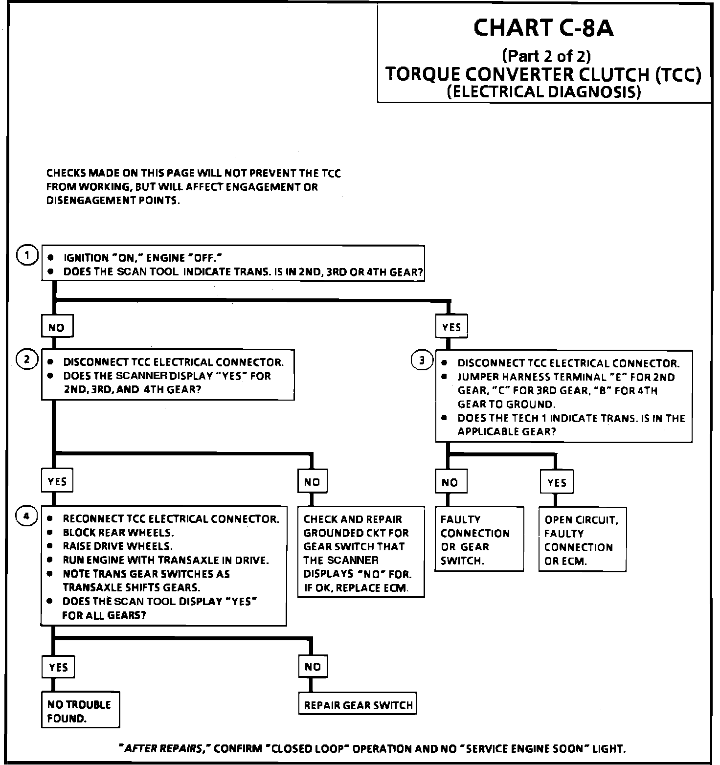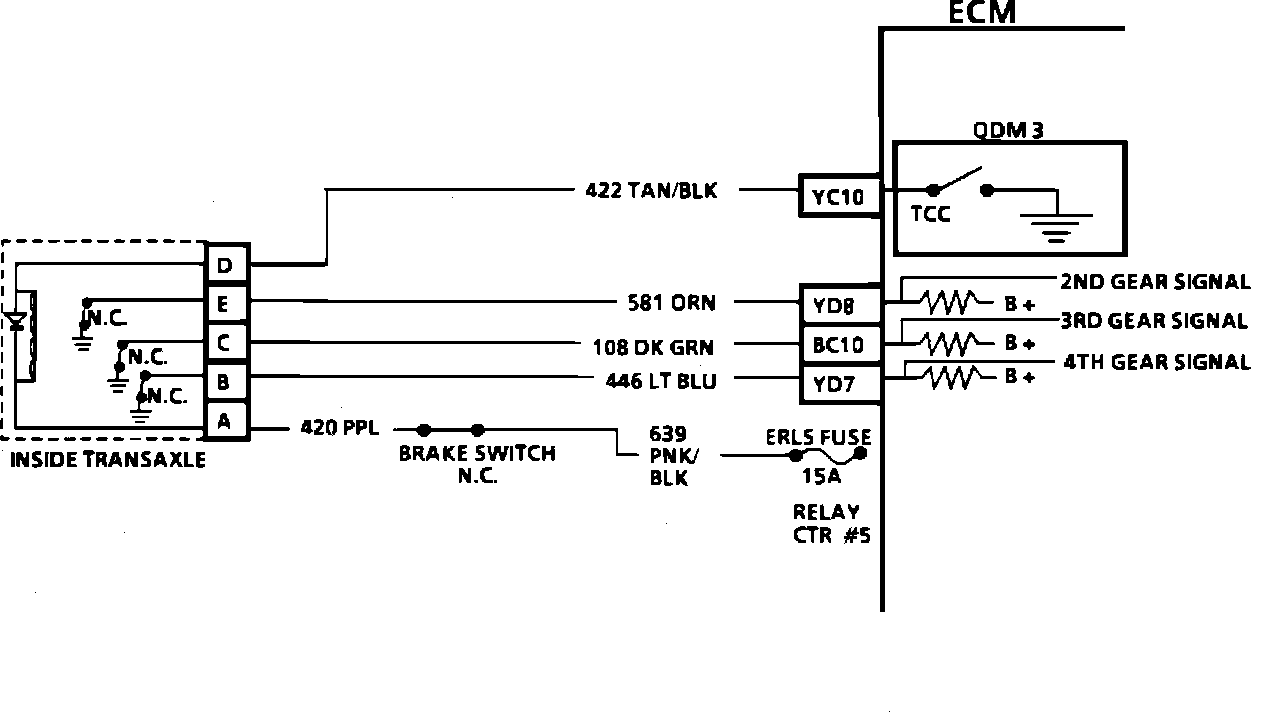 2. Determines whether the switch or signal circuit is open. The circuit can be checked for an open by measuring the voltage at the TCC connector. Should be about 12 volts.