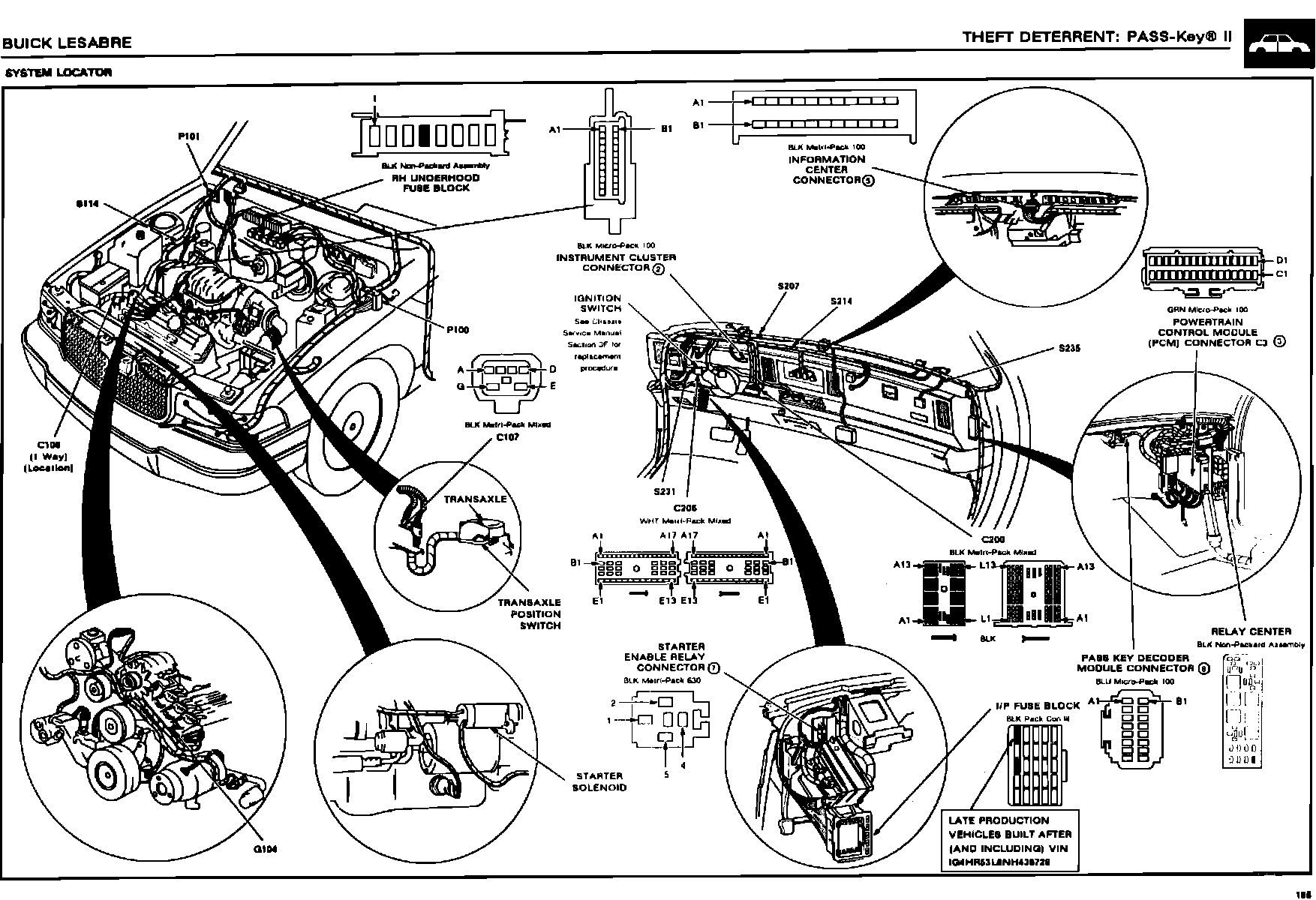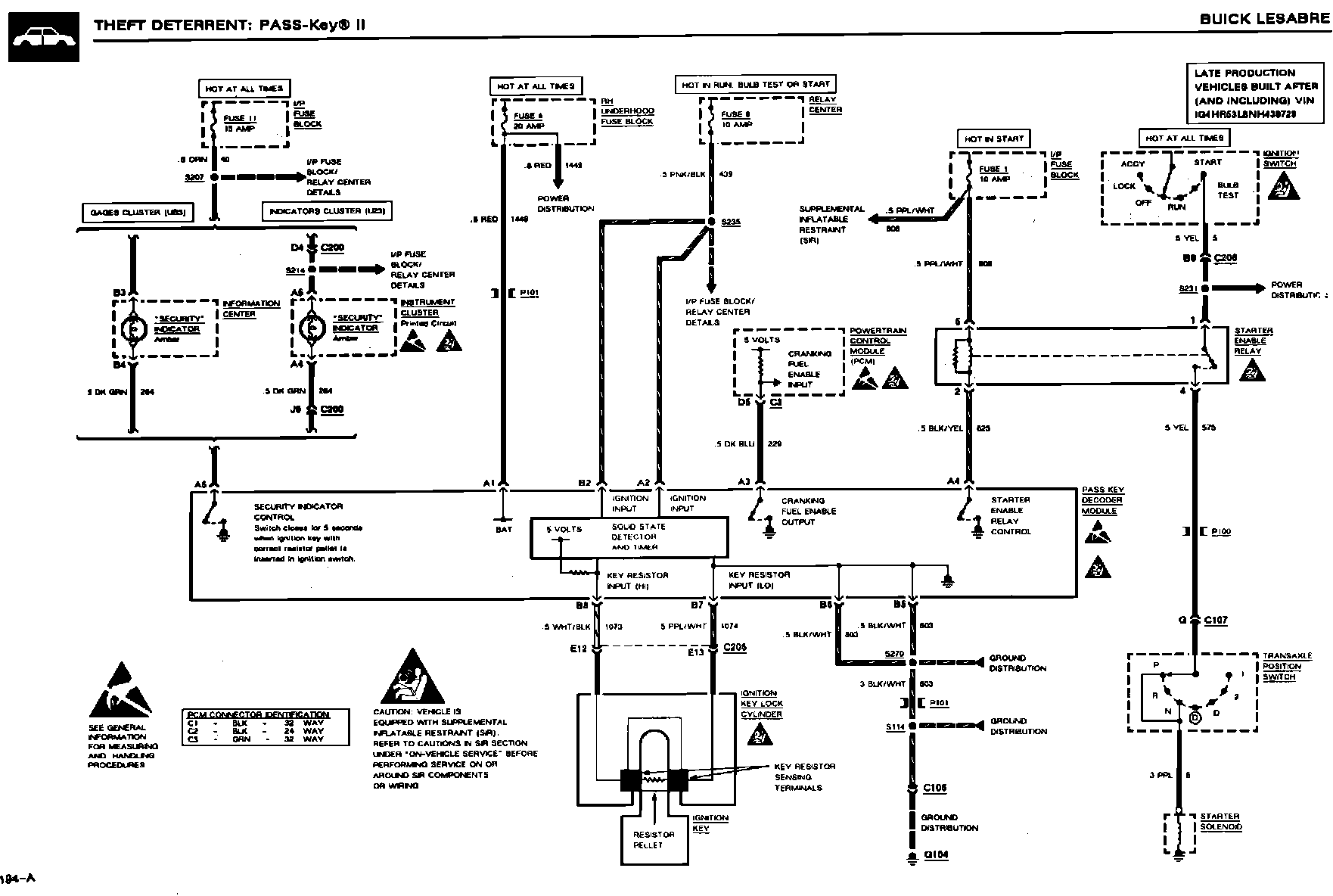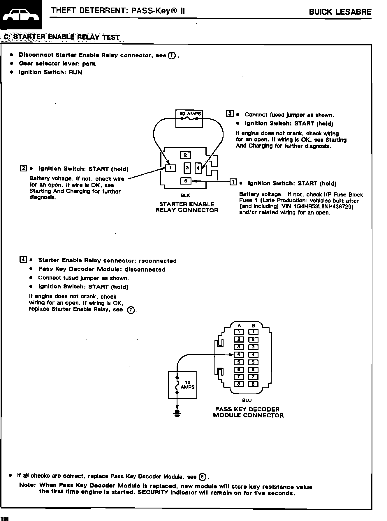 On LeSabres built before VIN NH436308, replace the starter enable relay with Part Number 25609047 (refer to service manual for starter enable relay location) and change the wiring as per the procedure). On LeSabres built after (and including) VIN NH436308, first update the existing service manual information with the enclosed information, then diagnose "no crank" condition using the service manual diagnostic procedures.