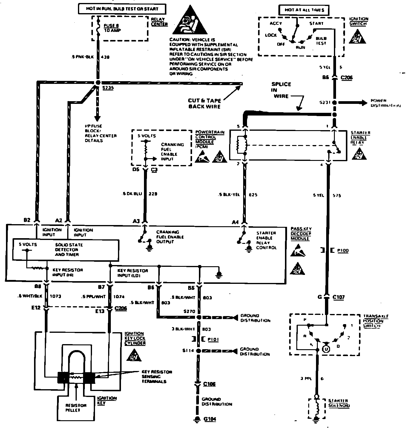 An intermittent no crank condition may be caused by a malfunctioning Pass-Key Relay. The security light will come on for two seconds (5 on LeSabre), and then go out, when attempting to start the vehicle. The vehicle, however, will not enable the starter.