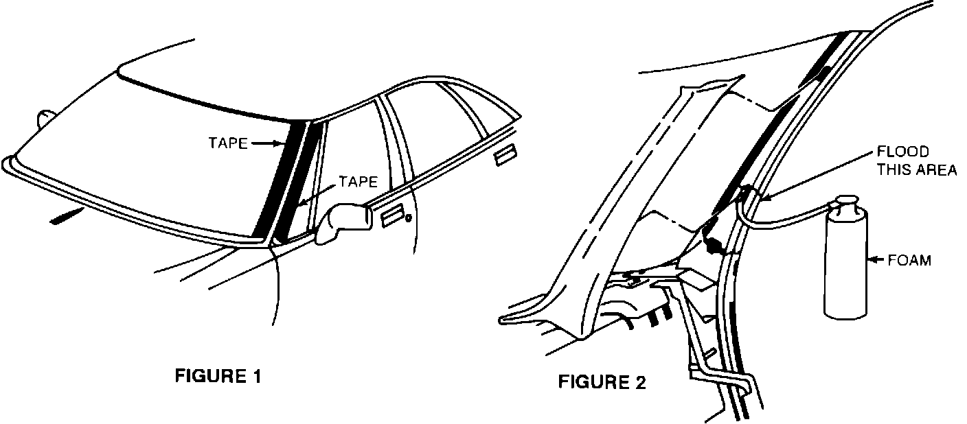 A high level of wind rush in the front pillar, that cannot be associated with charts A1, A3 or A4, may be internal to the pillar itself. The pillar has an expandable foam plug in its base and may not be completely sealed. Noise from this source will be fairly uniform when checked all along the inside of the windshield during the road test. Before repair is started, cover the windshield side reveal molding and its mating surface on the windshield and the door glass run channel with duct tape (See figure 1) and road test again. If there is no improvement, proceed with the repair method as described below. If the taping improves the condition, re-evaluate for conditions A1 and/or A3 and/or A4.