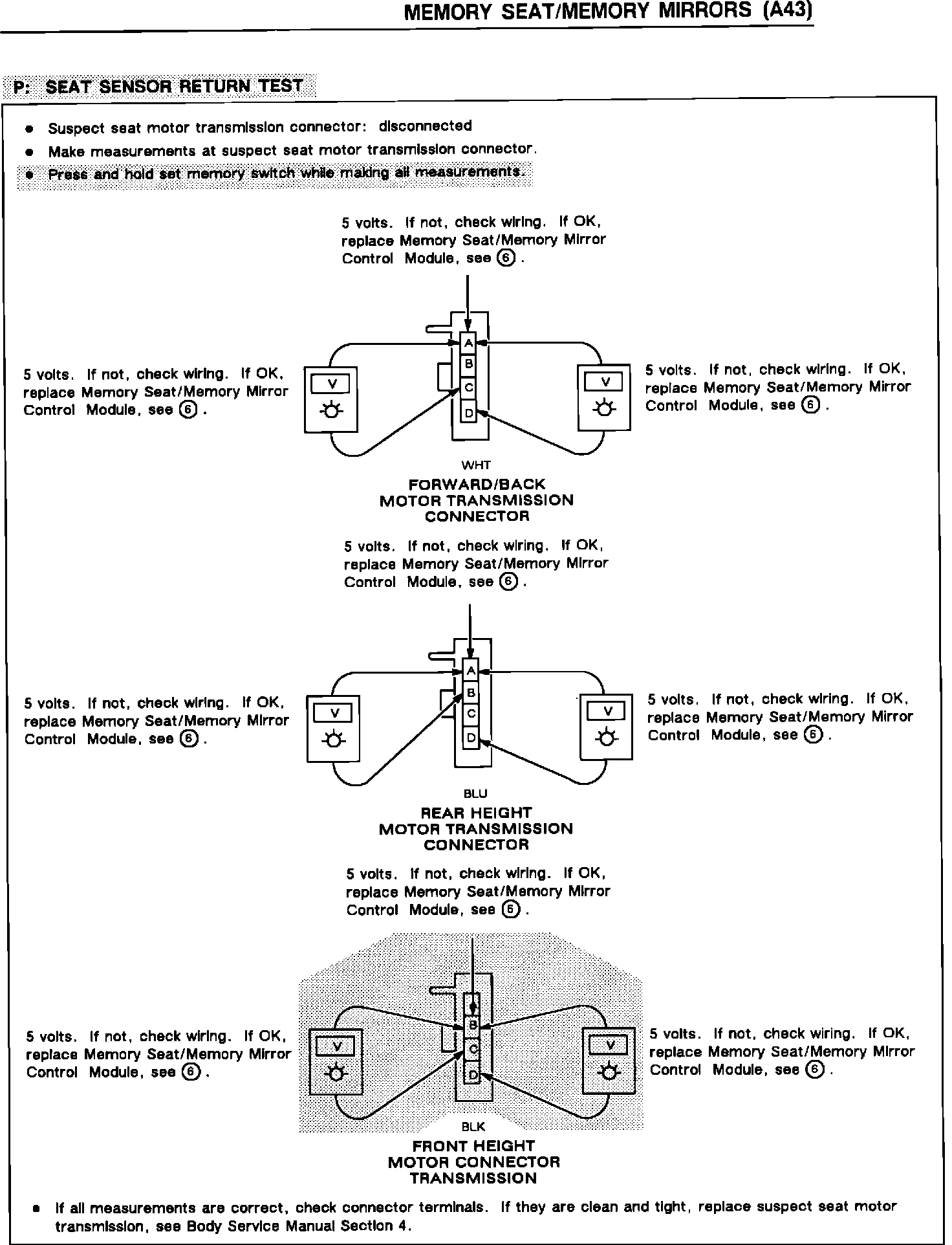 The information given in TESTS L, M and P found in the above Electrical Systems Manuals contain errors that could lead to confusion and misdiagnosis of the MEMORY SEAT/MEMORY MIRRORS (A43) system.