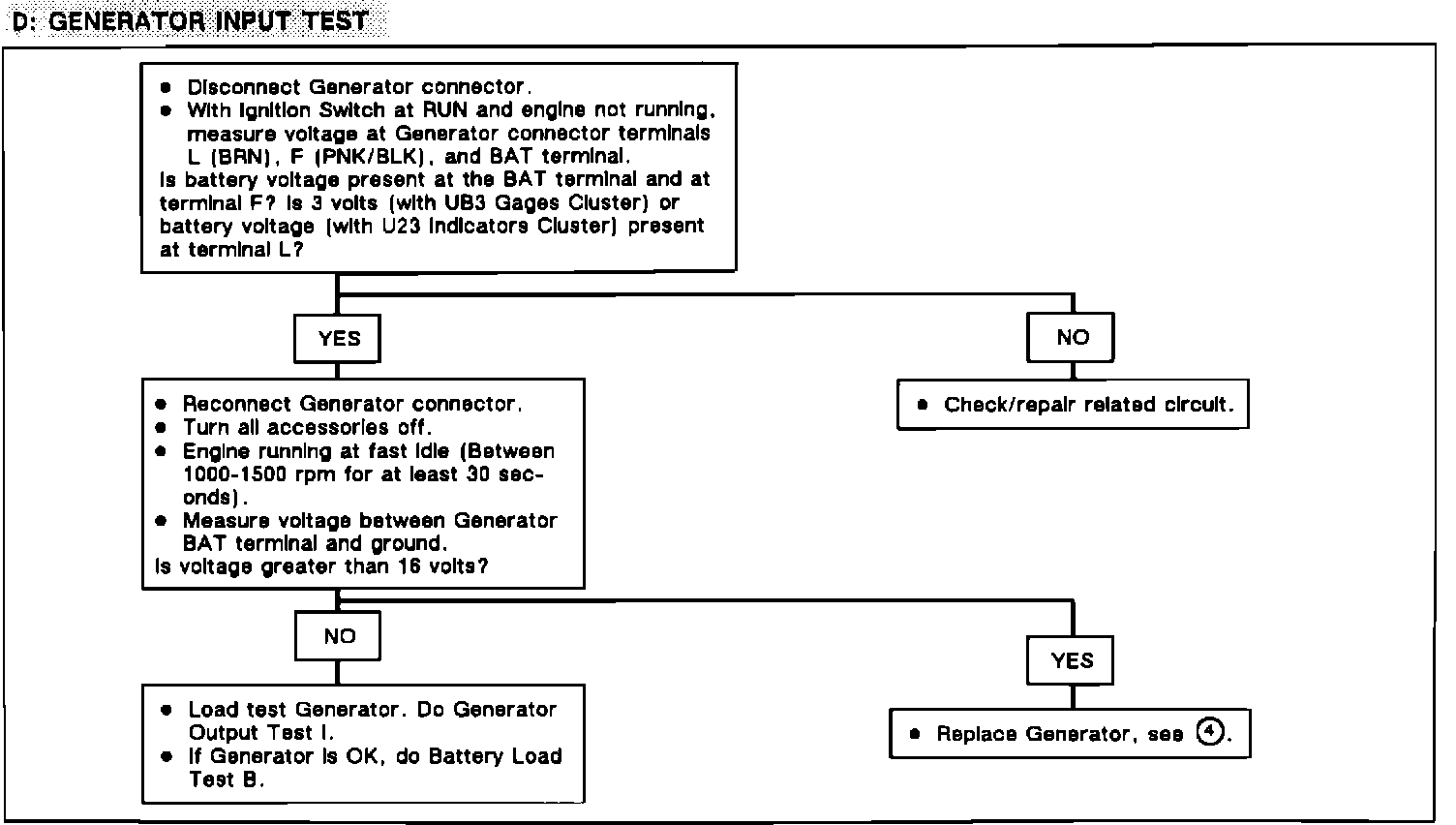 The following procedure D, Generator Input Test, Page 51, has been updated for testing the generator on vehicles equipped with Gage Cluster (UB3) for correct diagnosis.